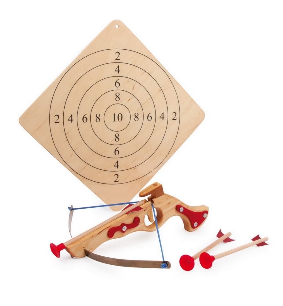 Eine Armbrust mit Zielscheibe und drei Pfeilen. Ein Sportgerät für größere und große Kinder. Mit Übung ein Meisterschütze werden. Hochwertige Gummikappen lassen die Pfeile gut an glatten Flächen kleben.