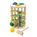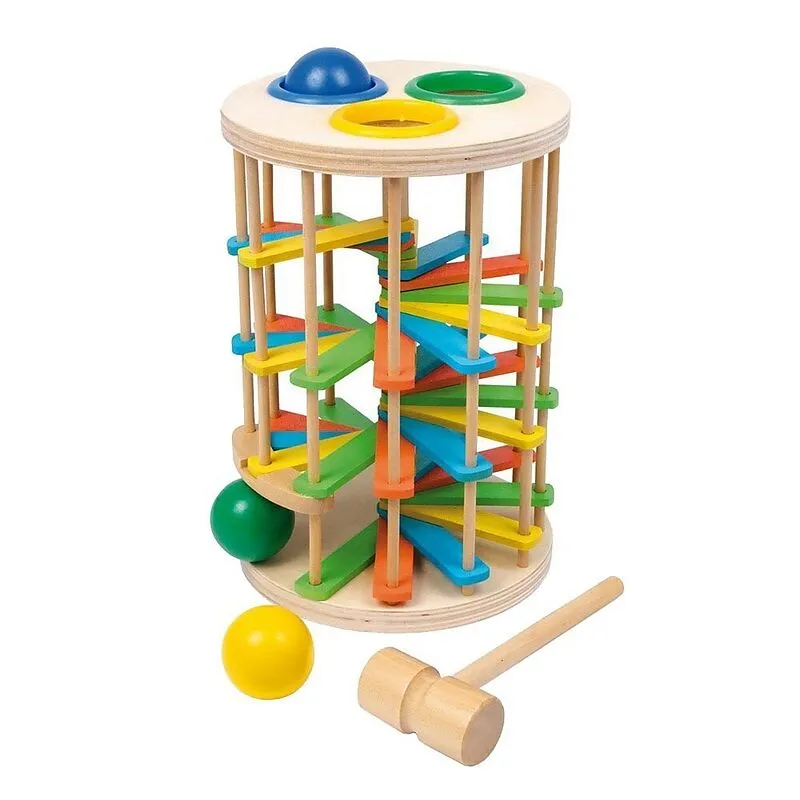 Das rummst und klackert so schön! Drei bunt lackierte Holzkugeln werden mit einem gezielten Hammerschlag ins Innere des großen Holzturms befördert, von wo sie mit fröhlichem Geklacker ihren Weg nach unten fortsetzen. Der Motorik-Turm ist ein Erlebnis für die K...