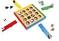 Welche Maus landet im Loch? Mit Hilfe von vier Schleuderwippen gilt es, die Figuren in die farblich markierten Löcher zu befördern. Dabei kann durch unterschiedlich starke Schläge auf die Wippe gesteuert werden, wie weit die Mäuse fliegen. Eine Herausforderung...