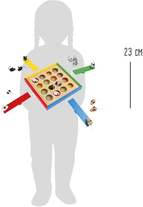 Welche Maus landet im Loch? Mit Hilfe von vier Schleuderwippen gilt es, die Figuren in die farblich markierten Löcher zu befördern. Dabei kann durch unterschiedlich starke Schläge auf die Wippe gesteuert werden, wie weit die Mäuse fliegen. Eine Herausforderung...