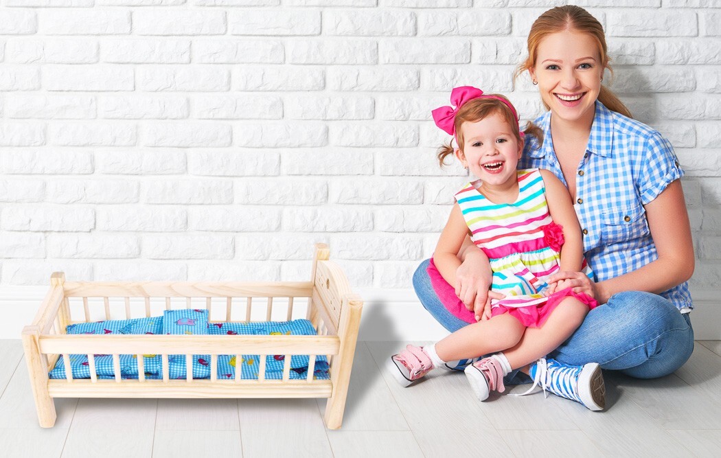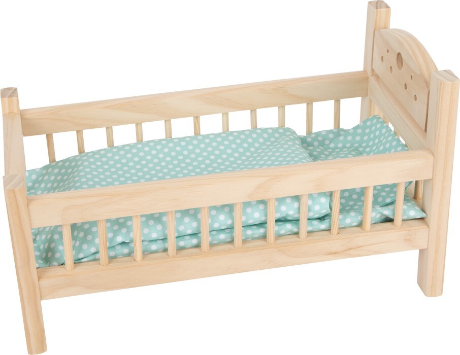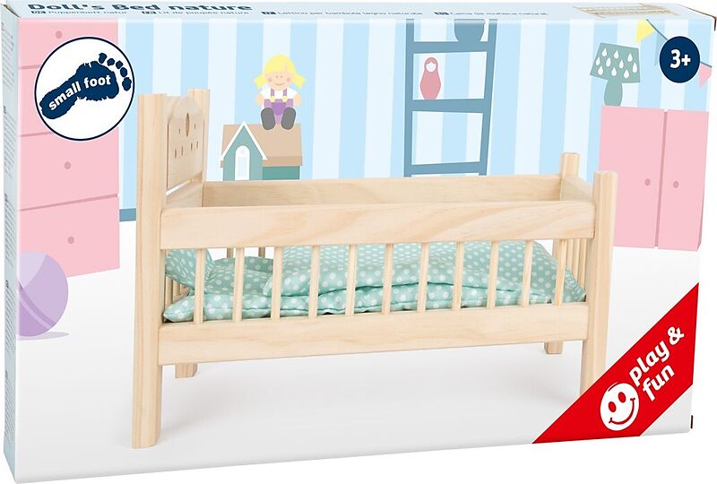 Auch Puppen wollen gut schlafen. Und das können sie in diesem Naturholzbett. Durch die Holzstreben wird das Holzbettchen zu einer stabilen Konstruktion und die bunt gestaltete Bettwäsche lässt keine Wünsche offen. Wäschedesign kann abweichen. Dieses Puppenbett...