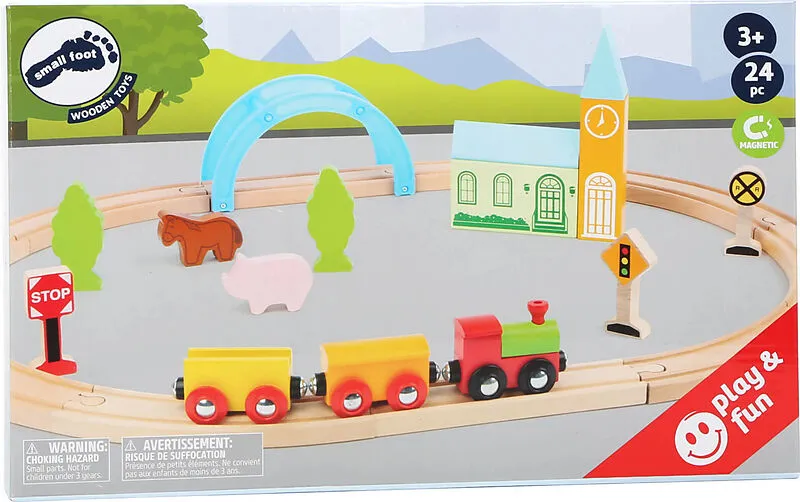 Eisenbahnidylle im Kinderzimmer! Dieses kompakte Eisenbahn-Set aus Holz hat alles, was das Eisenbahner-Herz begehrt. Spielend leicht kann eine Eisenbahnrunde erbaut und mit vielen Zubehörteilen zu einer hübschen Eisenbahnwelt gestaltet werden, sodass der Holzz...