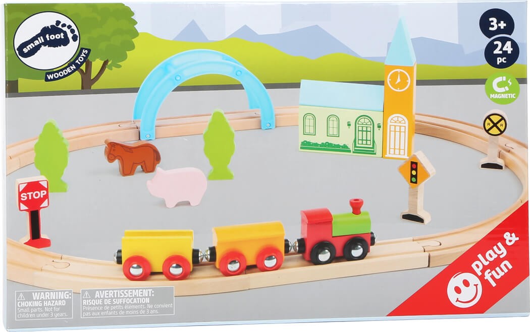 Eisenbahnidylle im Kinderzimmer! Dieses kompakte Eisenbahn-Set aus Holz hat alles, was das Eisenbahner-Herz begehrt. Spielend leicht kann eine Eisenbahnrunde erbaut und mit vielen Zubehörteilen zu einer hübschen Eisenbahnwelt gestaltet werden, sodass der Holzz...