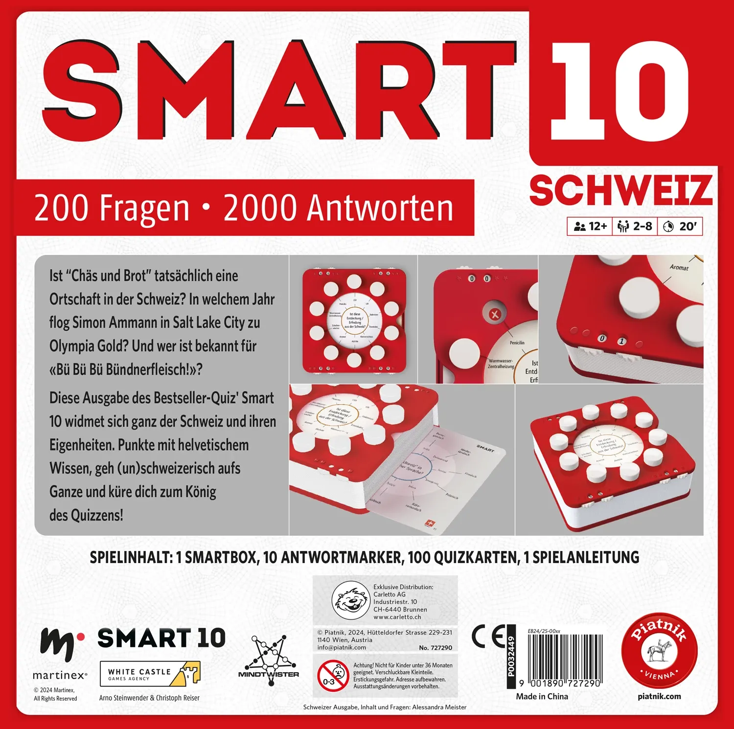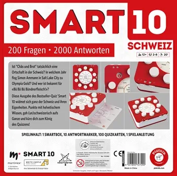 Ist Chäs und Brot tatsächlich eine Ortschaft in der Schweiz? In welchem Jahr flog Simon Ammann in Salt Lake City zu Olympia Gold? Und wer ist bekannt für «Bü Bü Bü Bündnerfleisch!»? Diese Ausgabe des Bestseller-Quiz' Smart 10 widmet sich ganz der Schweiz und i...38 Kunden haben diesen Artikel kürzlich gekauft.