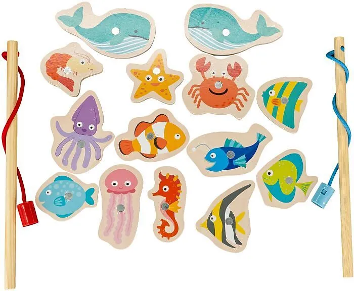 SpielMaus Holz Angelspiel, 12-teilig Mit dem SpielMaus Holz Angelspiel werden die motorischen Fähigkeiten des Kindes gefördert. Im Set enthalten 2 Angeln im Wal-Design mit Magnet und 10 verschiedene Fische. Insgesamt 12 Teile. Maße ca. 22,5x22,5 cm. Für Kinder...