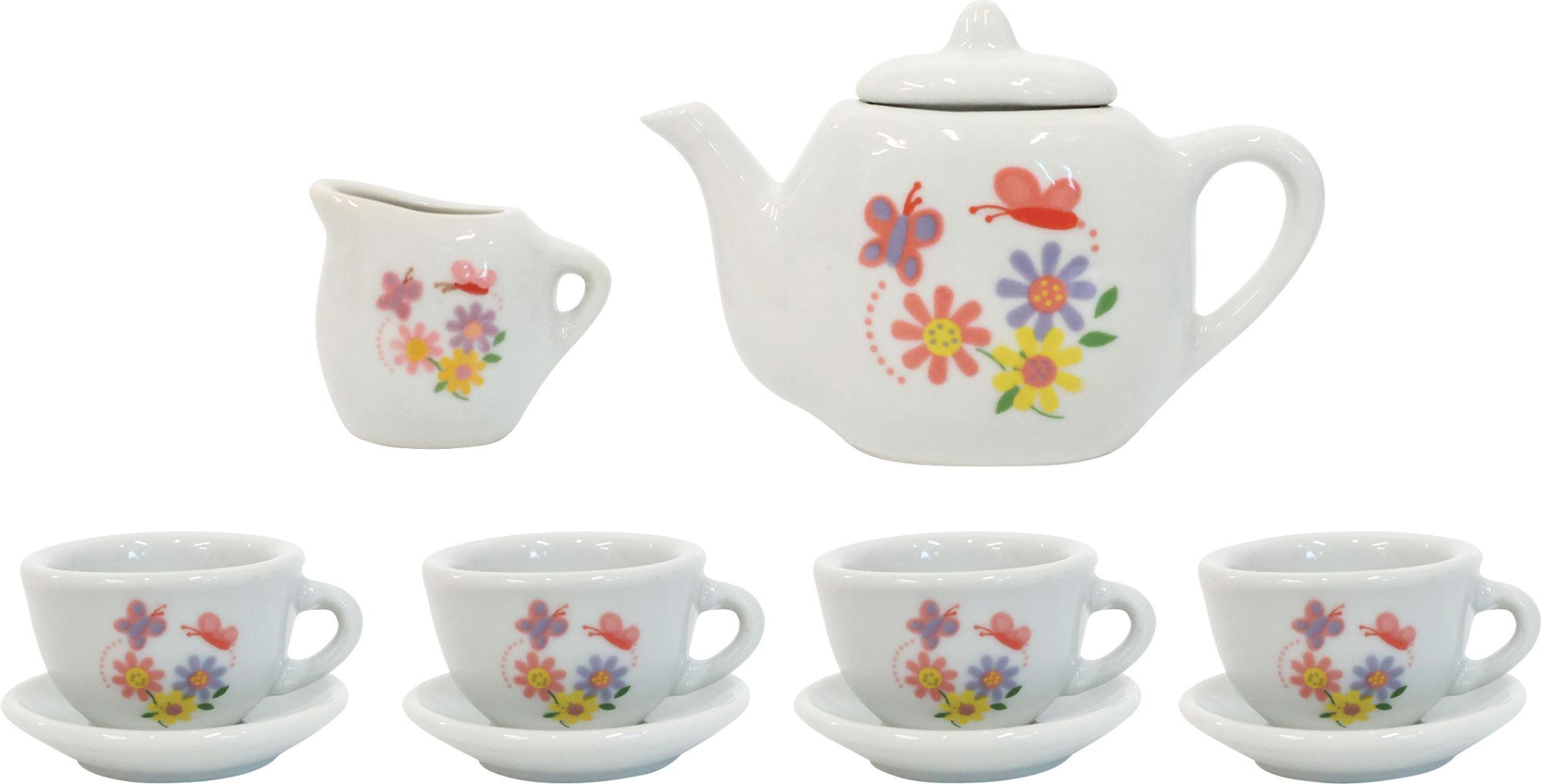 SpielMaus Küche Tee-Service aus Porzellan, 11-teilig Dieses bezaubernde Tee-Service aus Porzellan besteht aus einer Teekanne mit Deckel, ein Milchkännchen und sechs Tassen mit Unterteller. Insgesammt 11 Teile. Perfekt für eine nette Teezeit. Für Kinder ab 3 Ja...