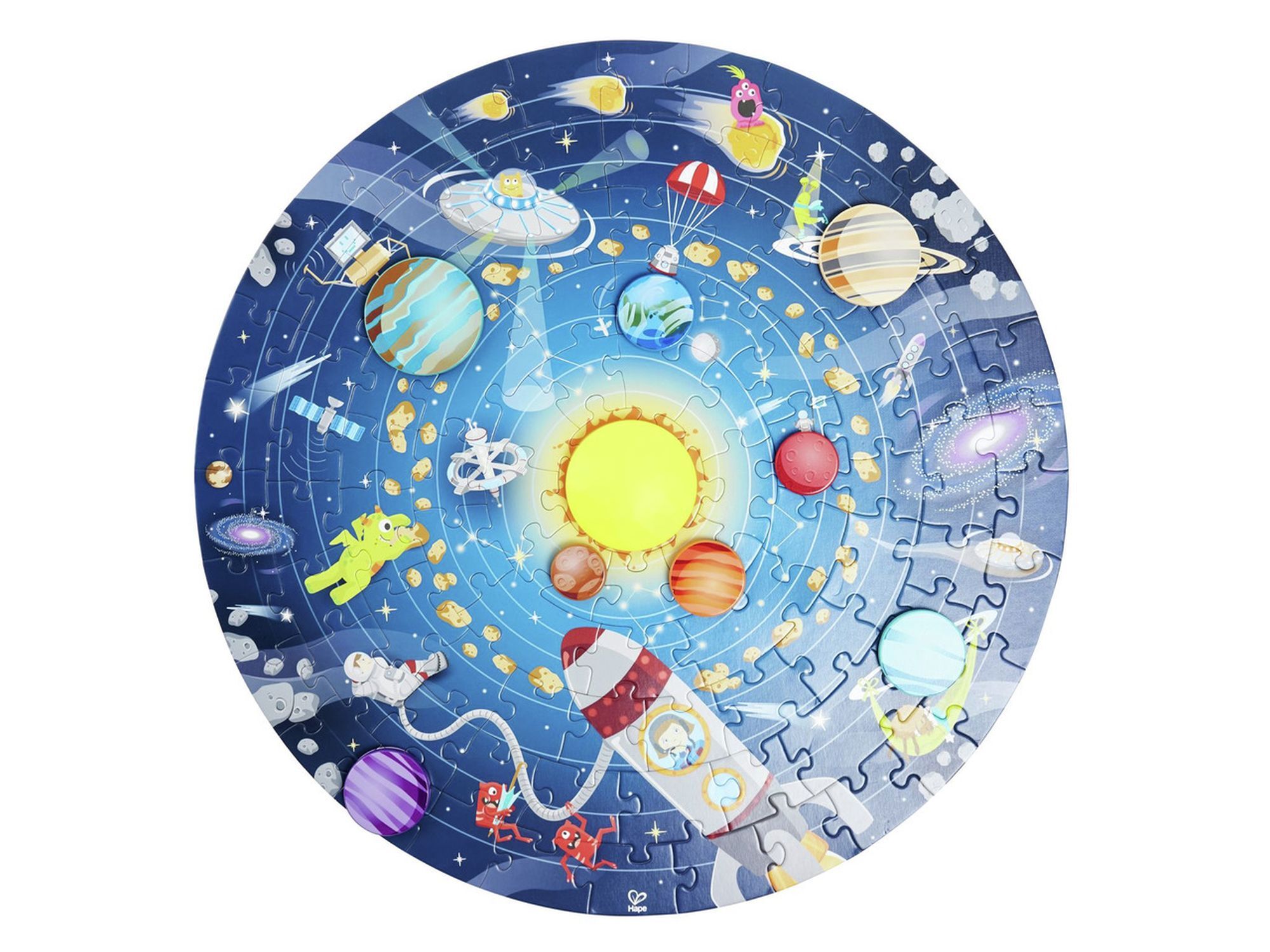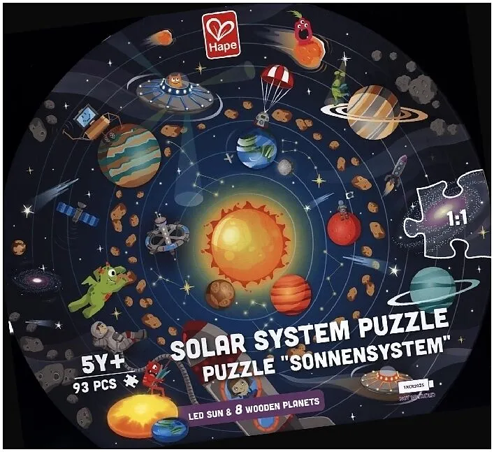 Die Sonne bringt das Licht zu allen Planeten, die sie umkreisen. Mit diesem Puzzle mit Planetenteilen aus Holz, einer leuchtenden LED-Sonne und einem Poster mit allen Planeten kannst du mehr über das Sonnensystem erfahren.