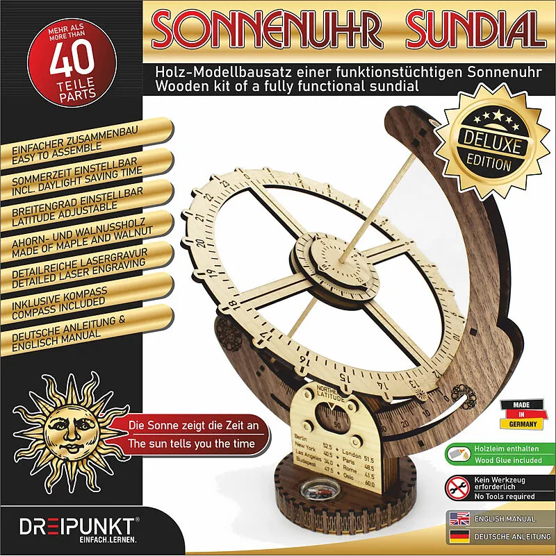 Sonnenuhren sind seit der Antike in Gebrauch. Sie zeigen die Zeit mit Hilfe eines Schattenwurfs auf einer Uhrzeitskala an. Diese moderne Sonnenuhr aus lasergeschnittenem Pappel-Sperrholz ist mit Hilfe einer ausführlichen Bauanleitung einfach zusammenzubauen. P...