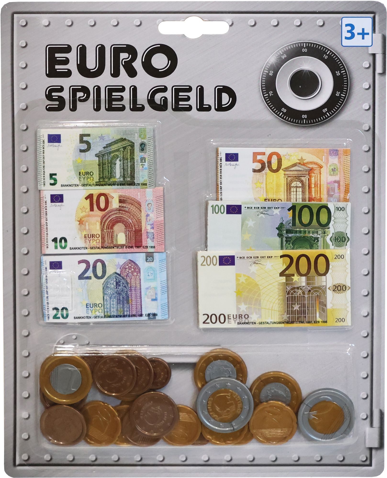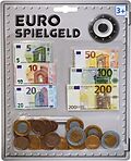 Eurocash Scheine und Münzen. Ein Muss für jeden Kaufmannsladen. Auf Blisterkarte. Kartengröße: W190xH250mm. Für Kinder ab 3 Jahren.