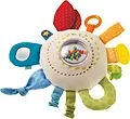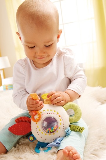 Egal, ob Beißelement, Spiegel, Rassel oder Glöckchen hier ist alles, was Babys Spaß macht, immer an Bord. Und dazu ist dieses Spielkissen noch so schön regenbogenbunt und, dreht man es um, kuschlig weich.