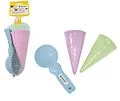 Die richtigen Förmchen für kleine Eismacher: Ob Erdbeere oder Zitrone - der Fantasie von kleinen Eismachern sind keine Grenzen gesetzt. Durch den Eisportionierer werden die Sandeiskugeln sogar mit einem lustigen Smiley geprägt. Serviert in den 2 bunten Eistüte...