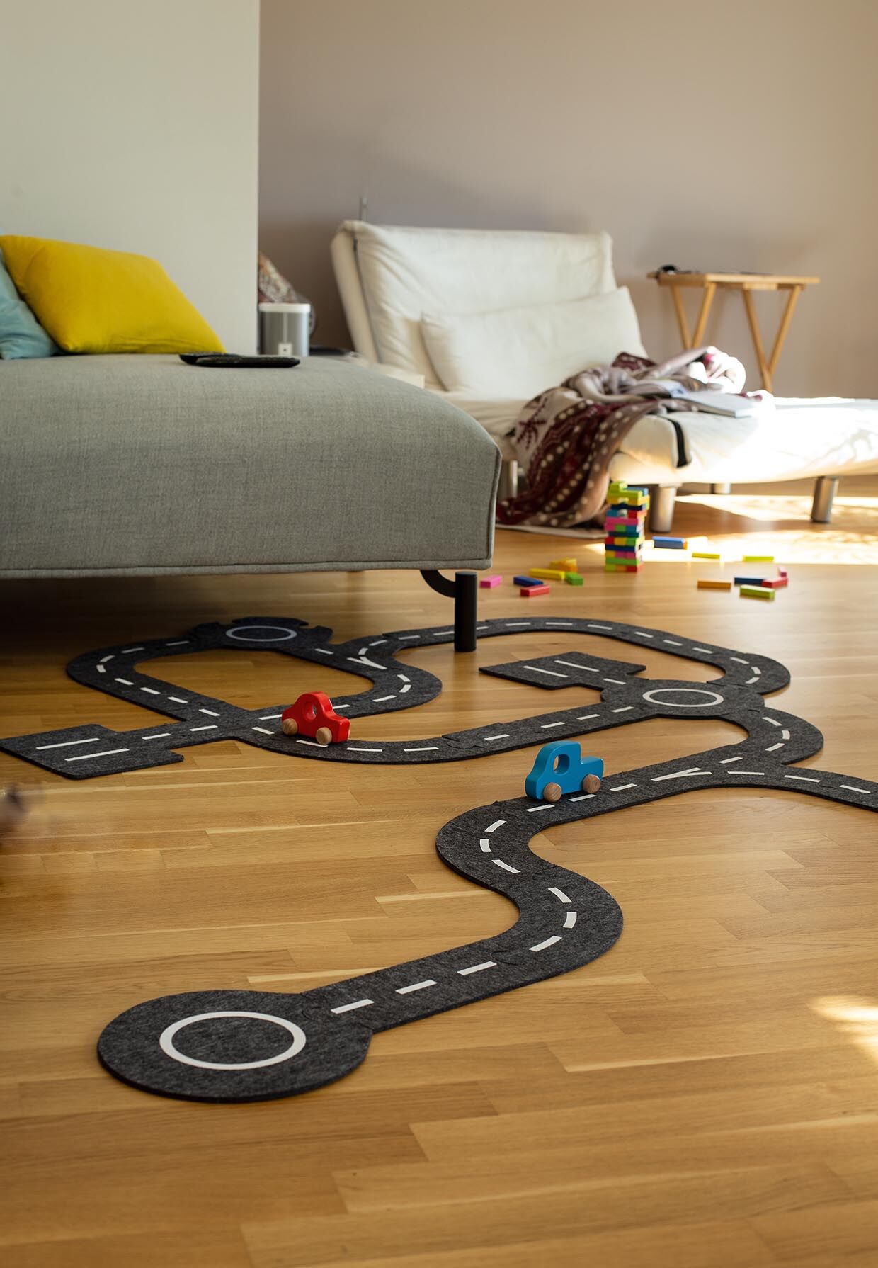 Entdecken Sie die Rennstrecke für Autos aus Filz der Marke Goki. Sehr einfach zu montieren, besteht aus 28 Teilen Filz-Puzzles und 2 Holzautos. Die Teile sind beidseitig bedruckt für viele Bauvarianten. Neben Straßen, Kurven und Kreuzungen gibt es auch Kreisve...