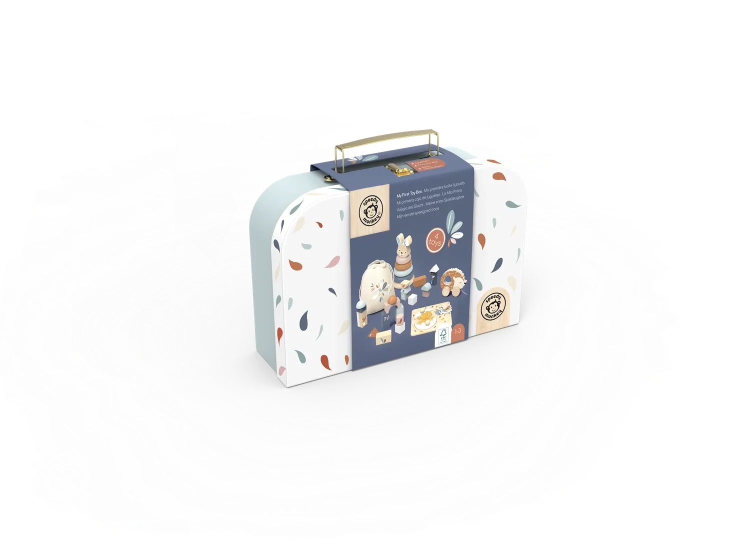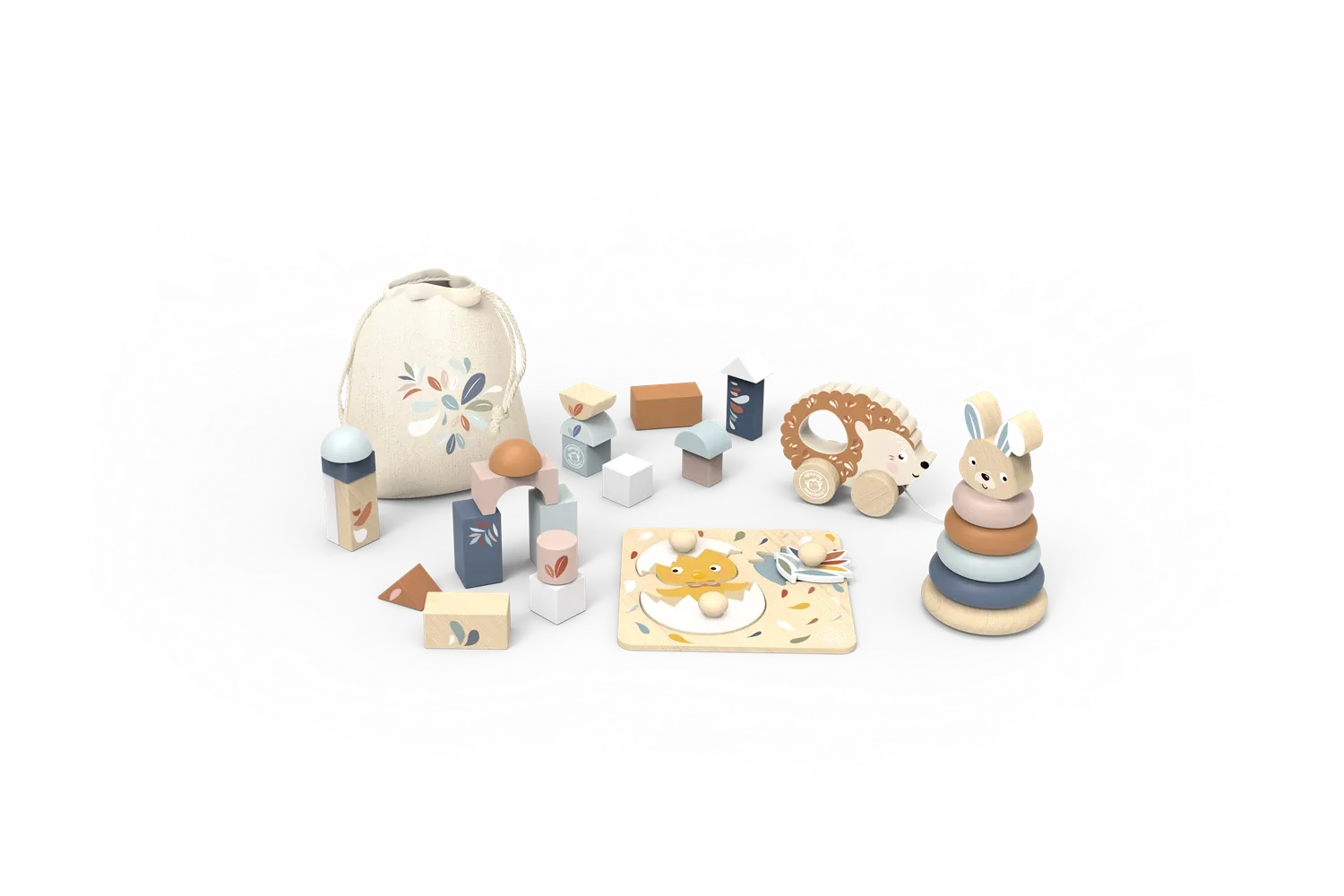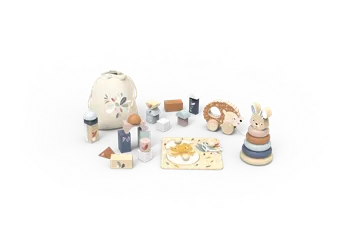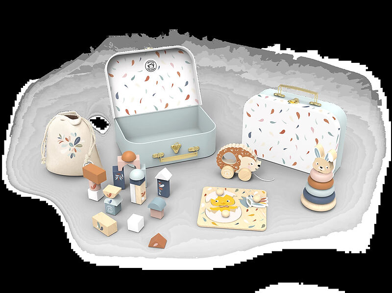 Dieses Set enthält alles, was kleine Kinder lieben: Stapelturm, Puzzle, Holzbausteine, Stofftasche zum Verräumen und ein Nachziehspielzeug. Der Koffer eignet sich perfekt zur Aufbewahrung und zum Mitnehmen aller Spielsachen. Dieses Spielzeug wird aus nachhalti...