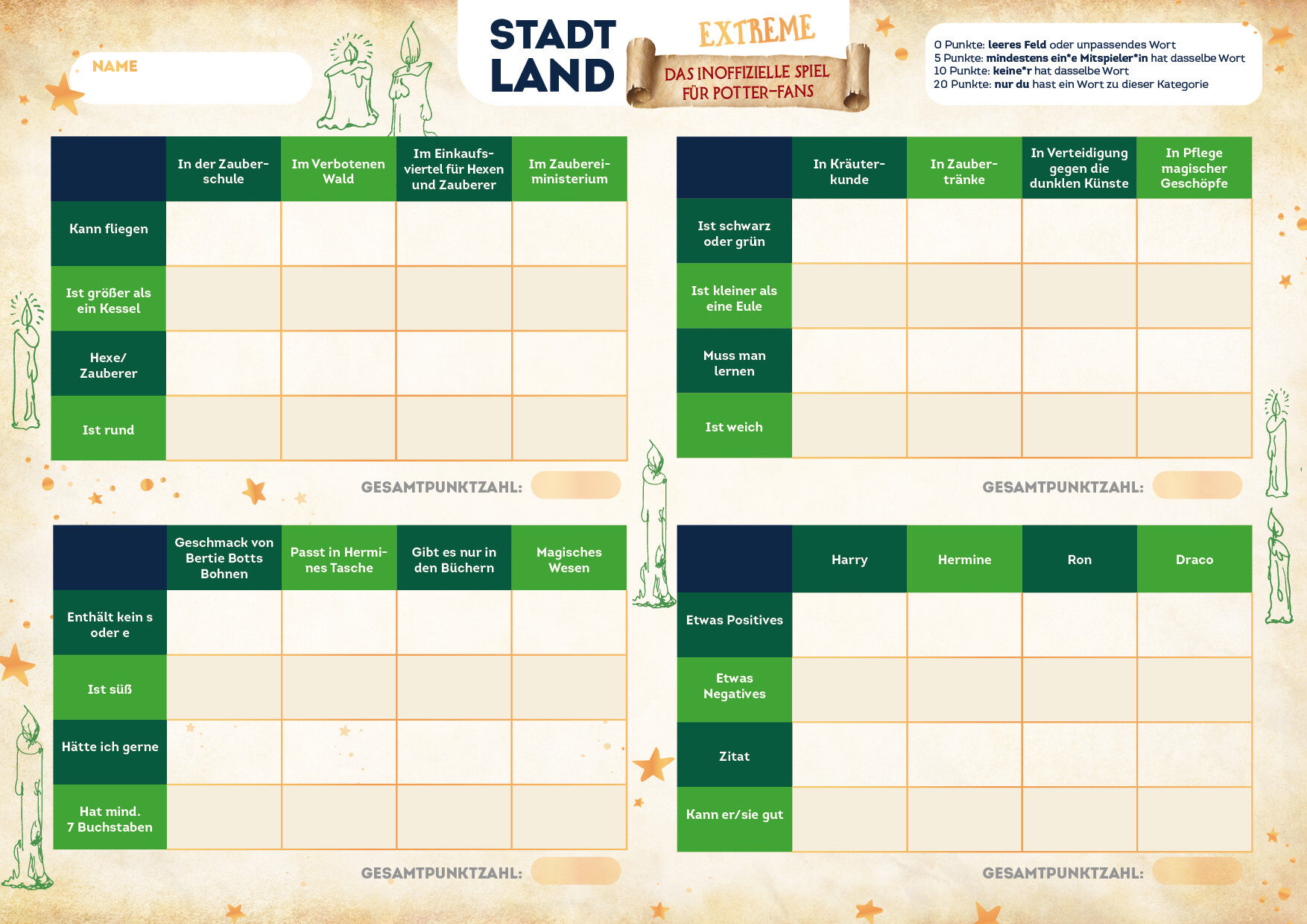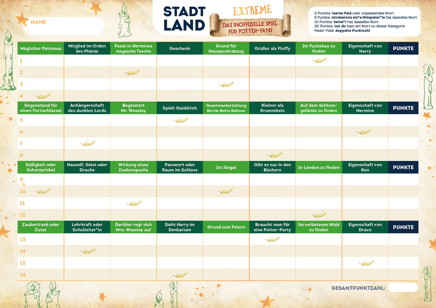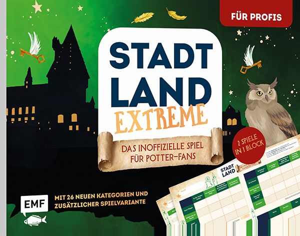 Der Spieleklassiker für alle Harry Potter-Fans von 8-99 Jahren Egal wo du bist - mit dieser spannenden Stadt, Land, Potter-Fan-Edition bringst du immer eine große Portion Spaß mit in die Runde! In 32 neuen Kategorien könnt ihr euer Zauberwelt-Wissen testen un...