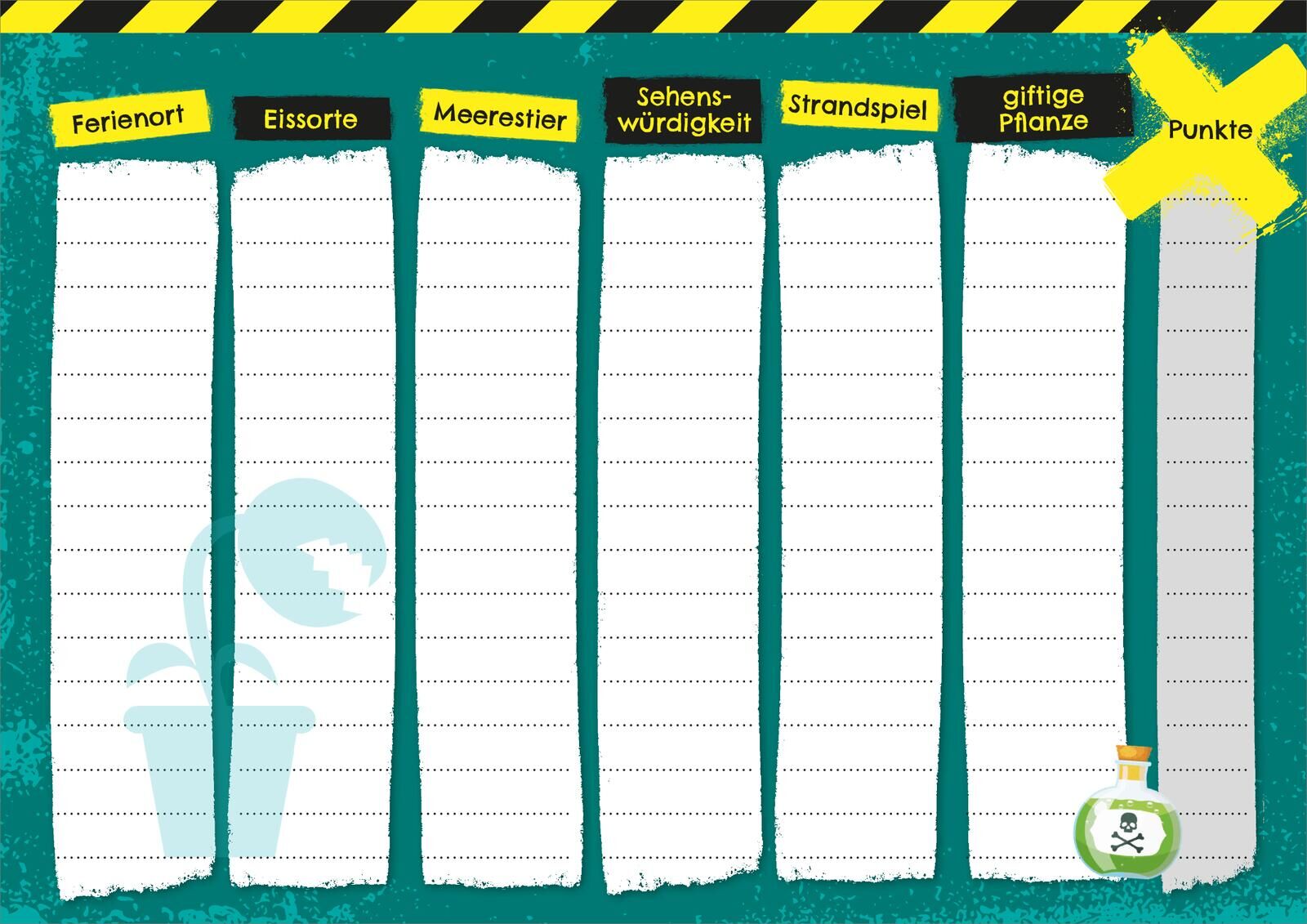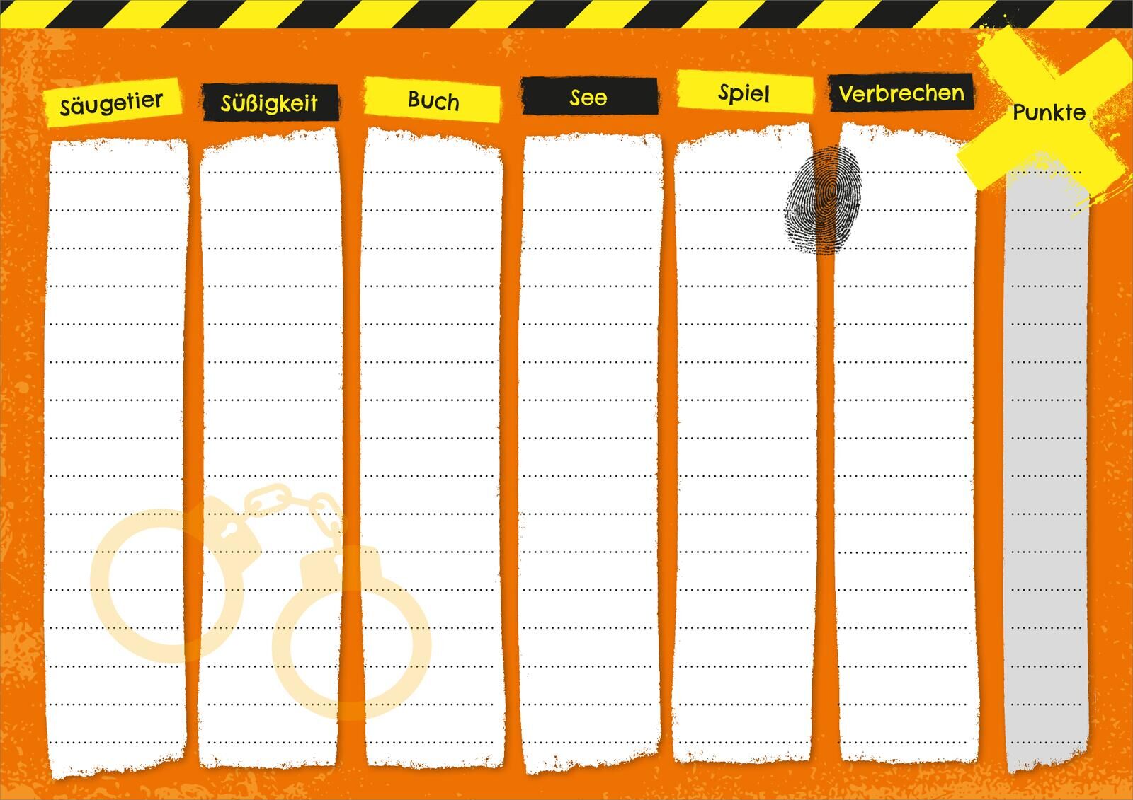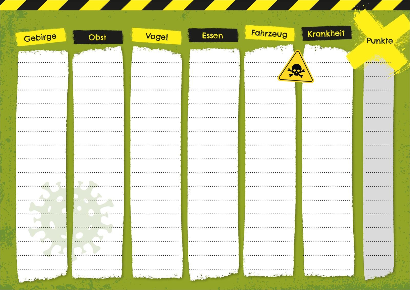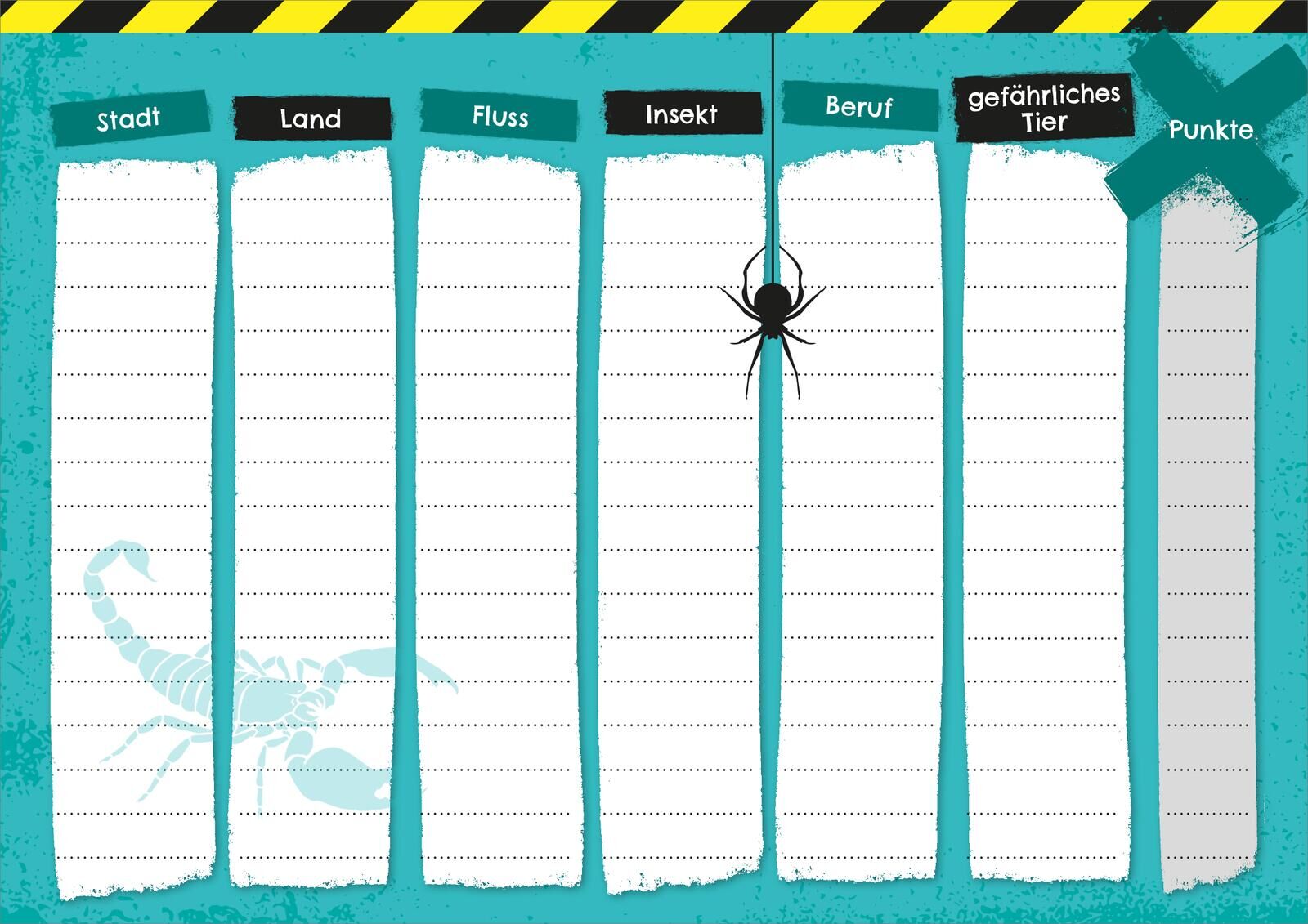 Spielspaß ohne Ende! In diesem Block finden sich über 90 Vorlagen für den Spieleklassiker "Stadt, Land, Fluss" - sowohl mit den klassischen Kategorien also auch mit ganz neuen, gefährlichen Rubriken! Es gibt 7 Spielvarianten mit zahlreichen Vorlagen...