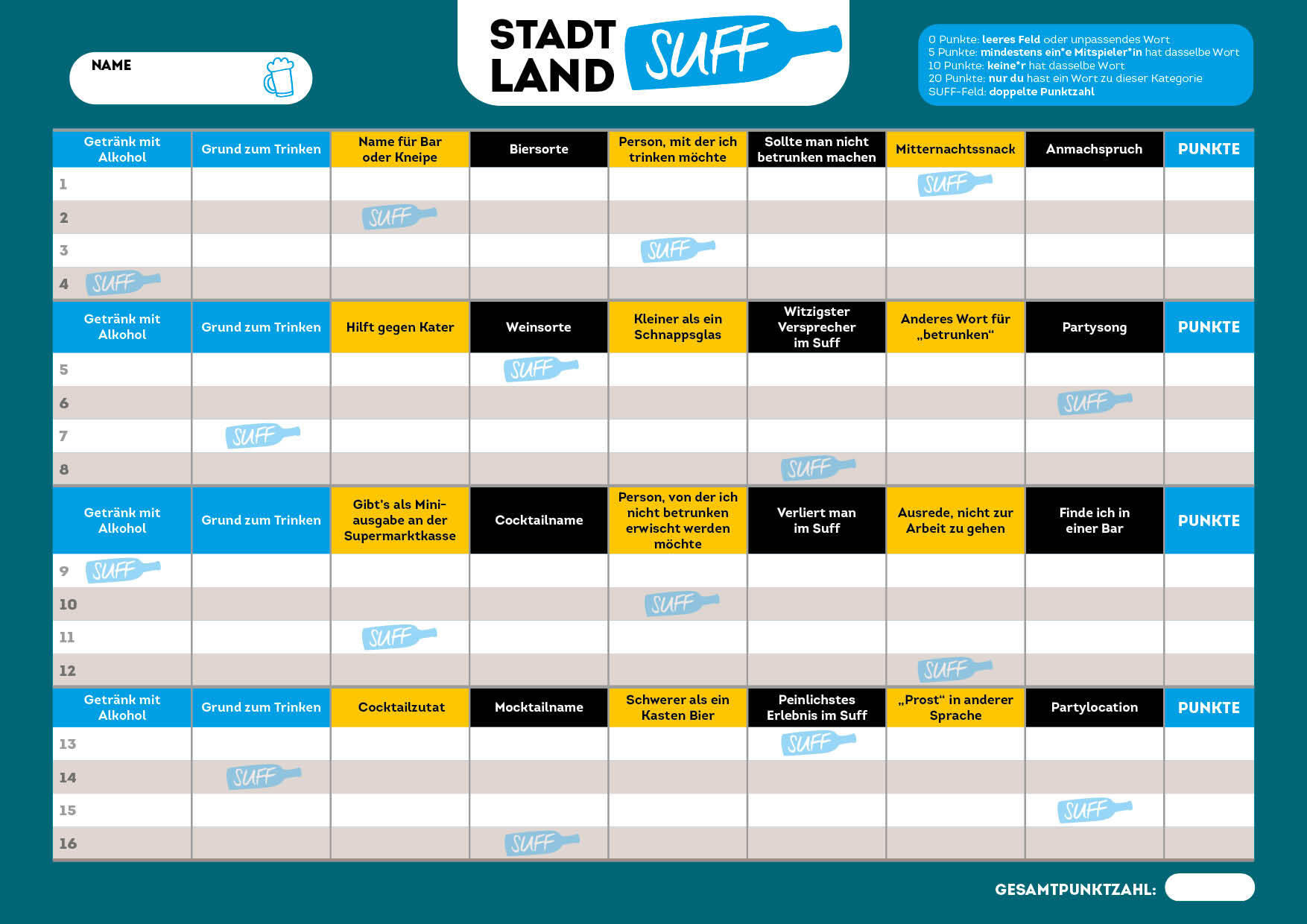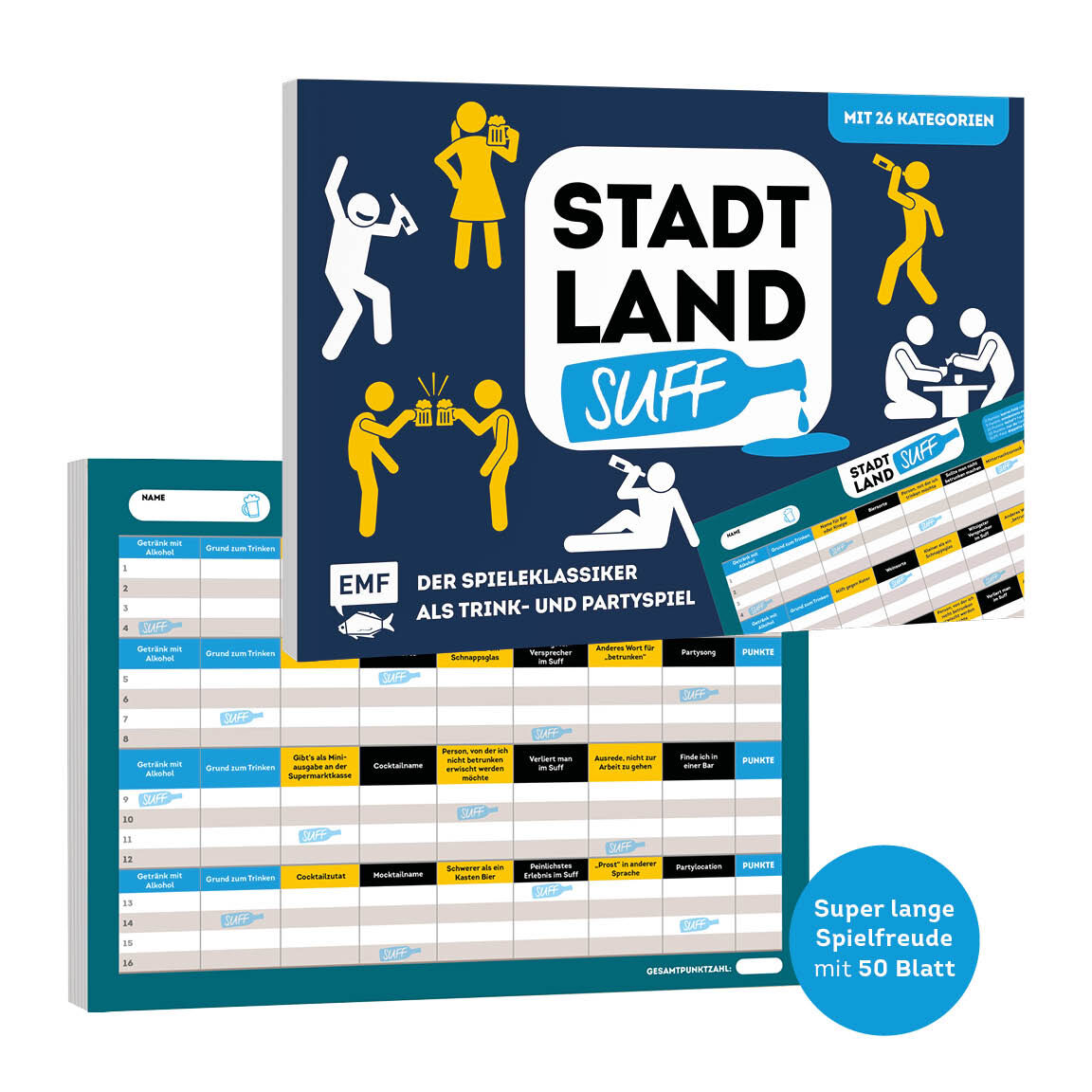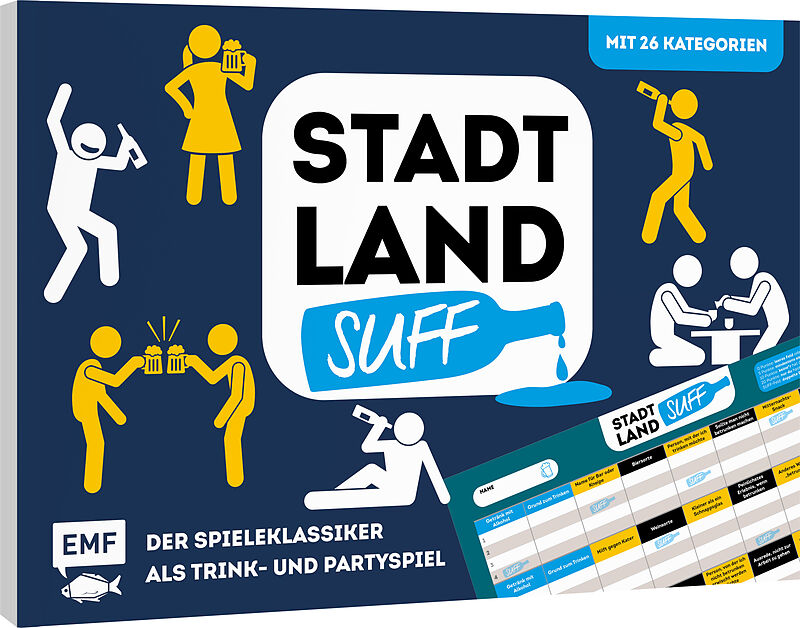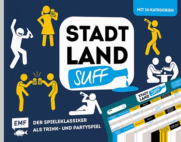 Der Spieleklassiker als temporeiches Trinkspiel für Spieler von 16-99 Jahren Egal wo du bist - mit dieser originellen Stadt, Land, Suff-Edition bringst du immer eine große Portion Spaß mit in die Runde! In 26 weinseligen Kategorien könnt ihr euer Wissen zum f...