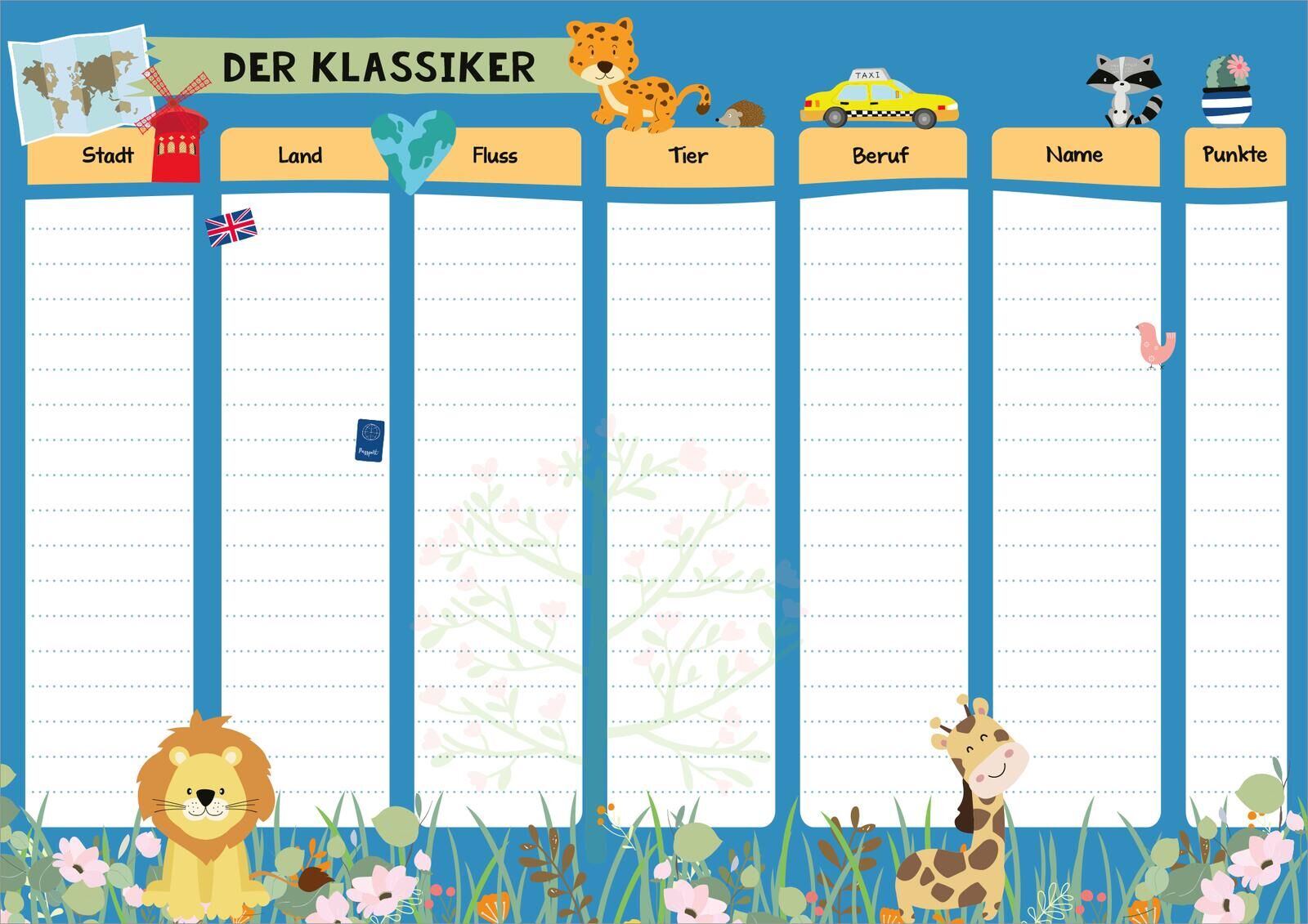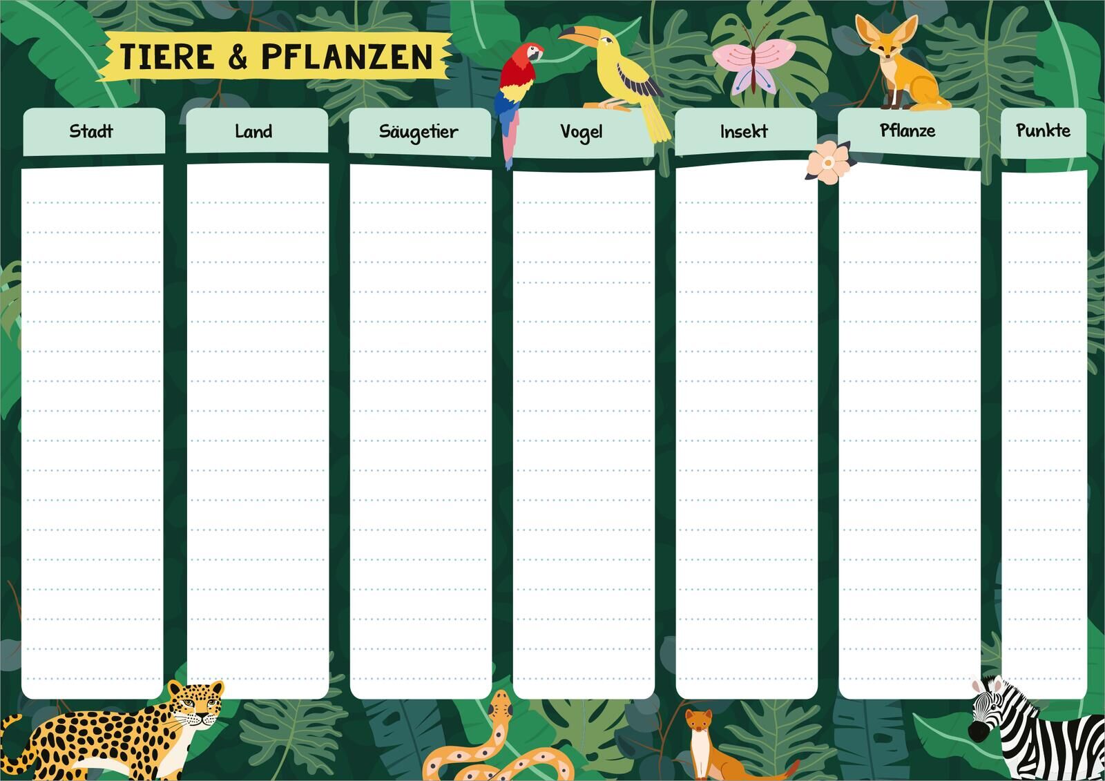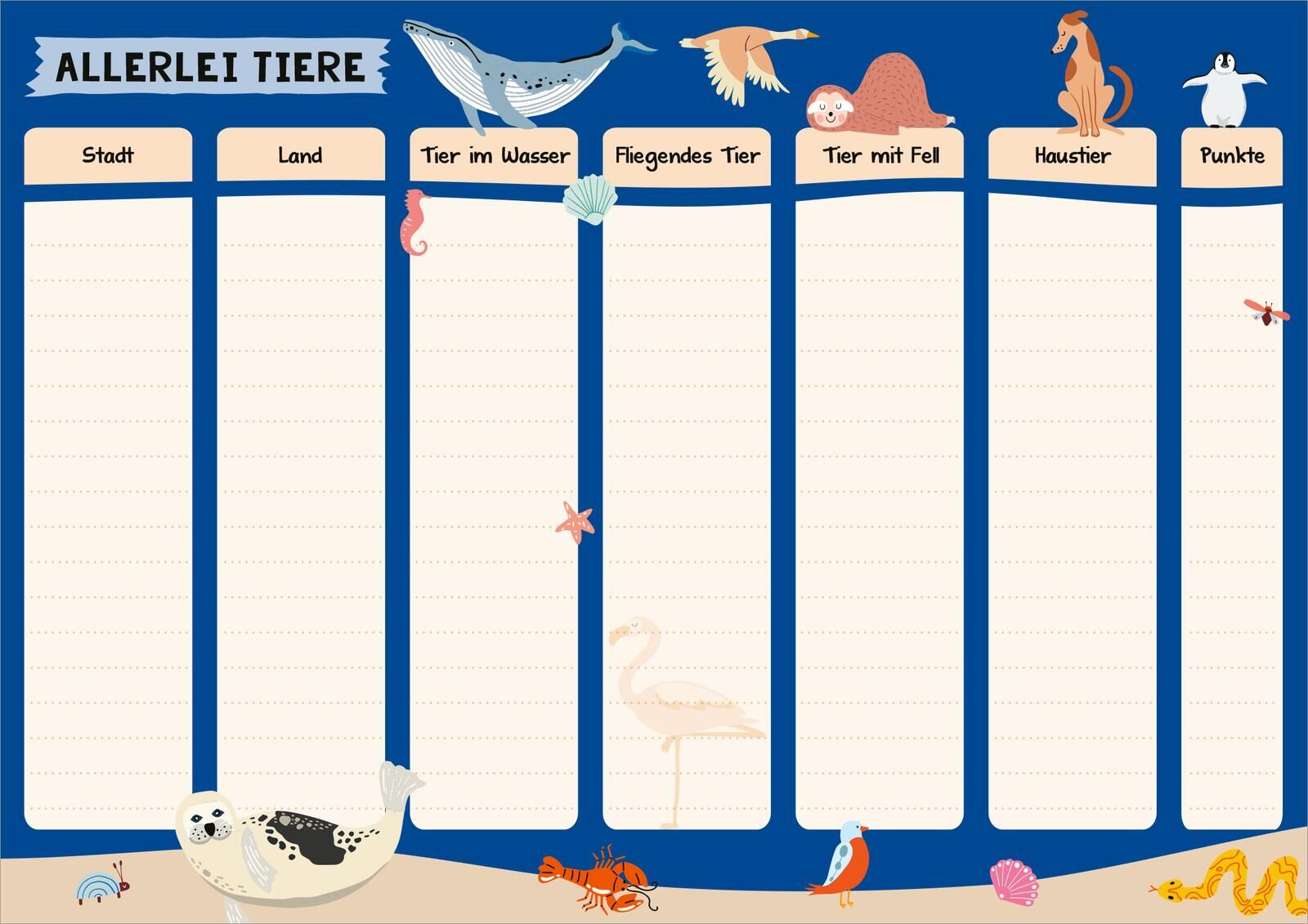 Tierischer Spielspaß ohne Ende! In diesem Block finden sich über 90 Vorlagen für den Spieleklassiker "Stadt, Land, Fluss" - mit vielen Kategorien speziell zur Tierwelt, aber auch mit den klassischen Varianten und mit anderen, ganz neuen, verrückten ...