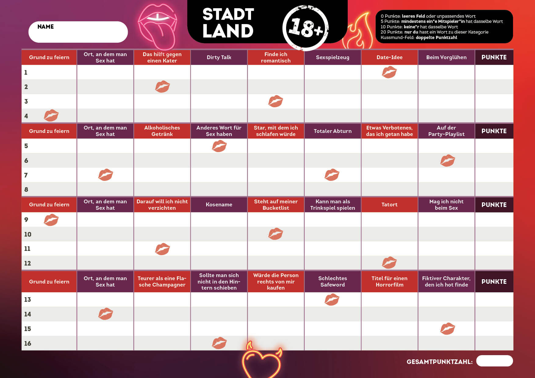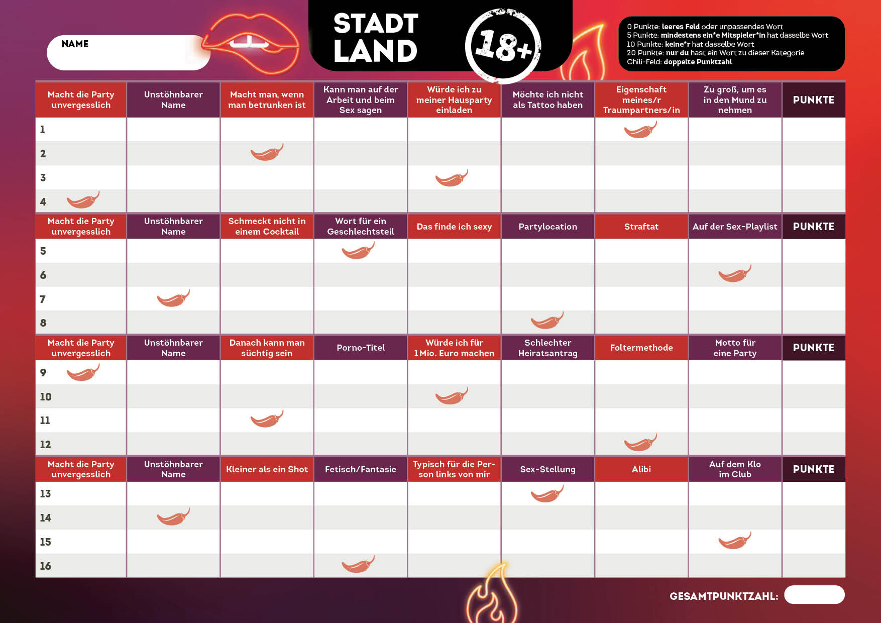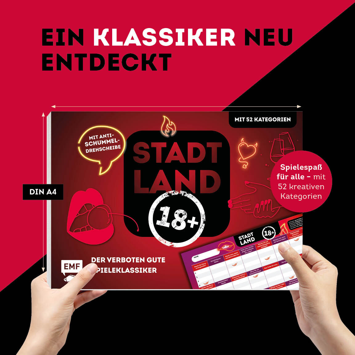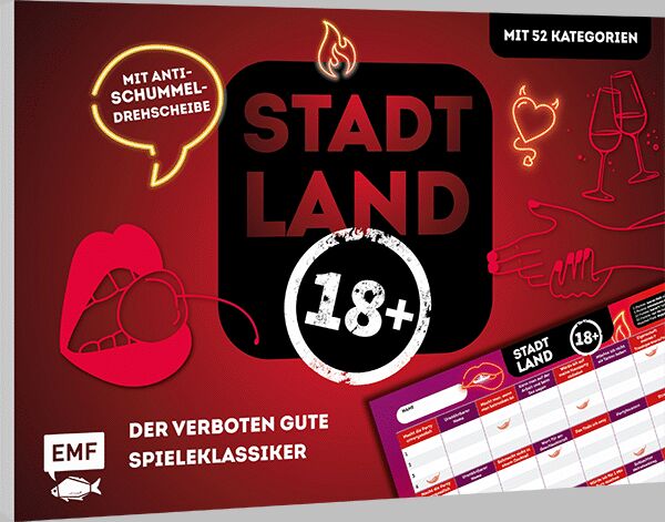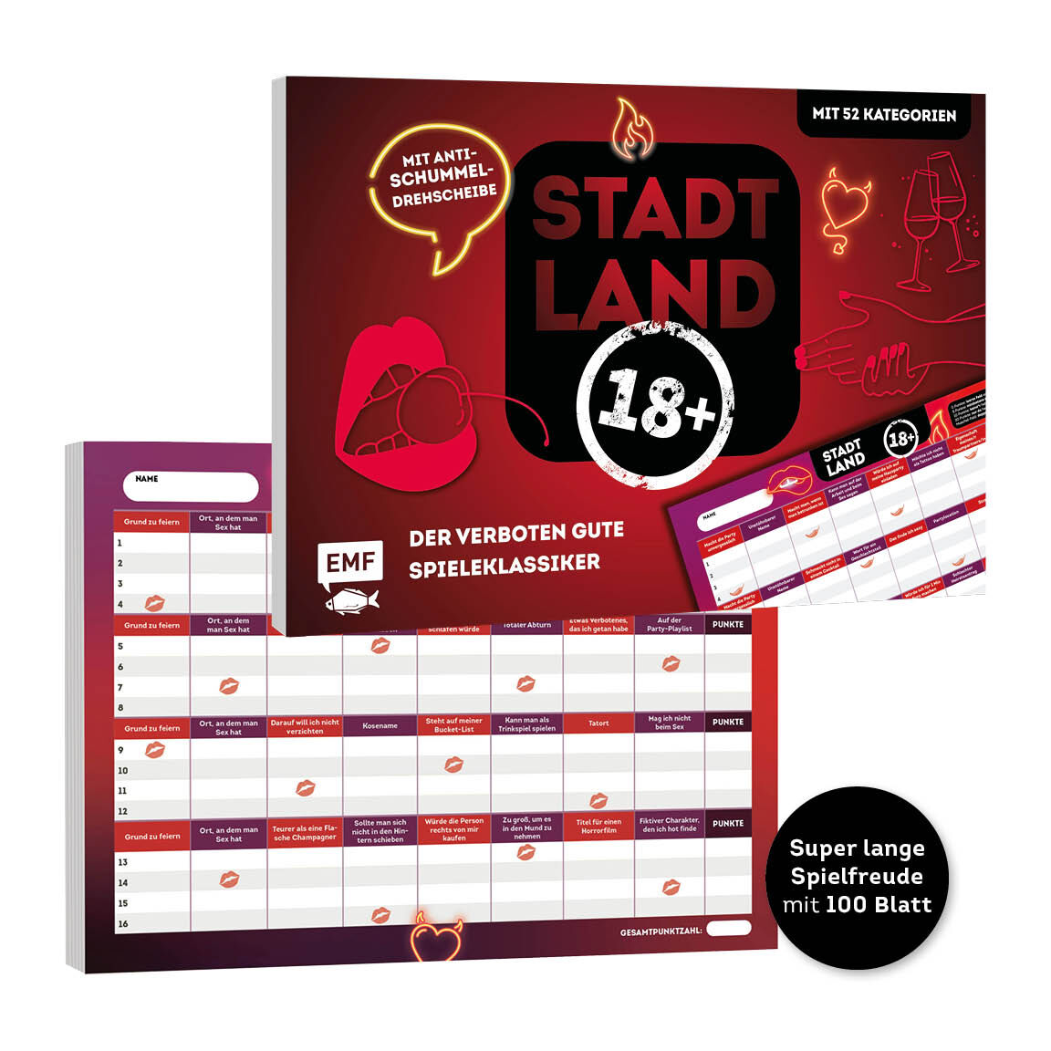 Der Spieleklassiker ab 18 Jahren Egal wo du bist - mit diesem verboten guten Stadt, Land, Ü18-Block bringst du immer eine große Portion Spaß mit in die Runde! In 52 Kategorien könnt ihr euer Wissen rund um Sex, Partys und Verbrechen testen und eure Kreativitä...