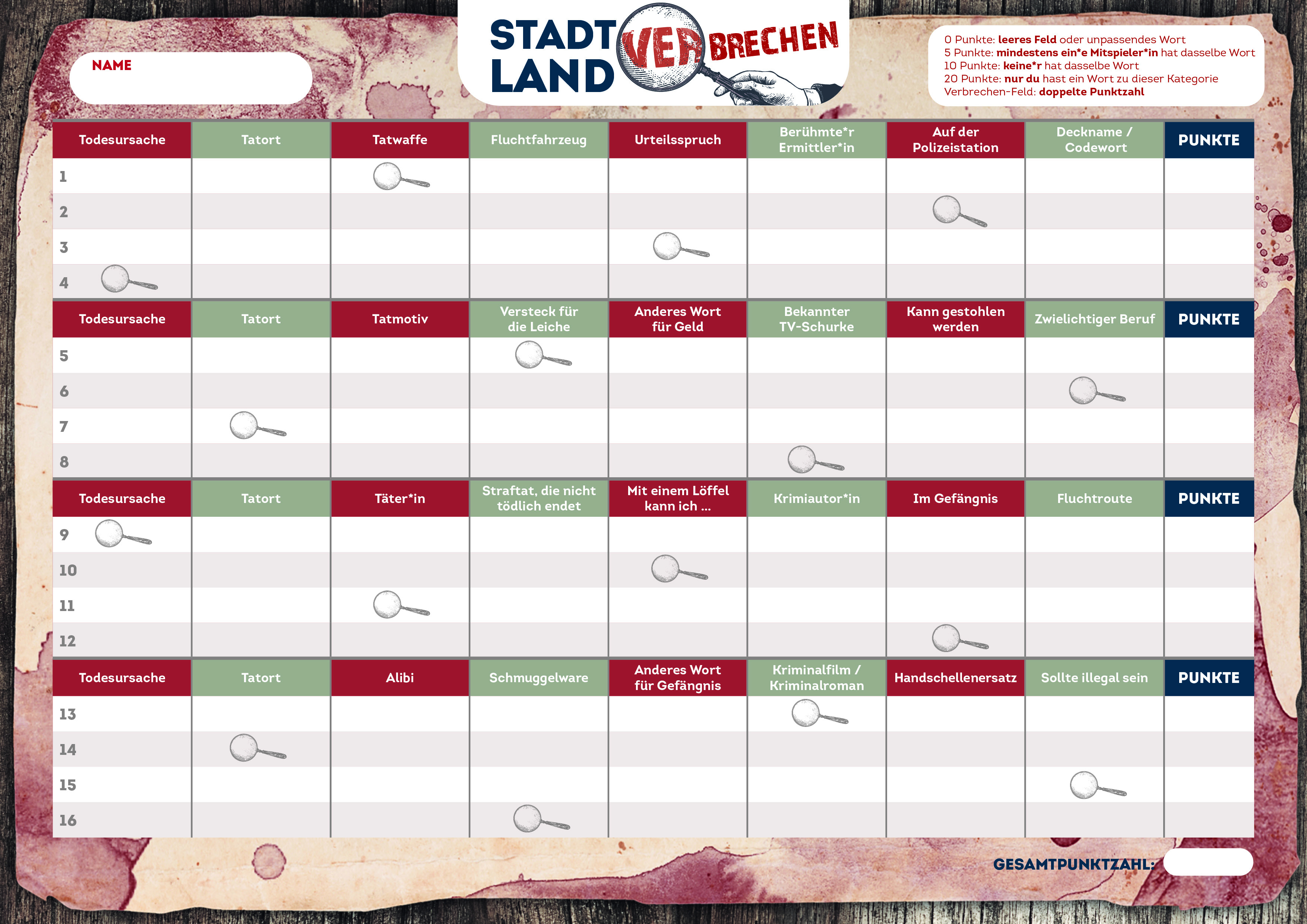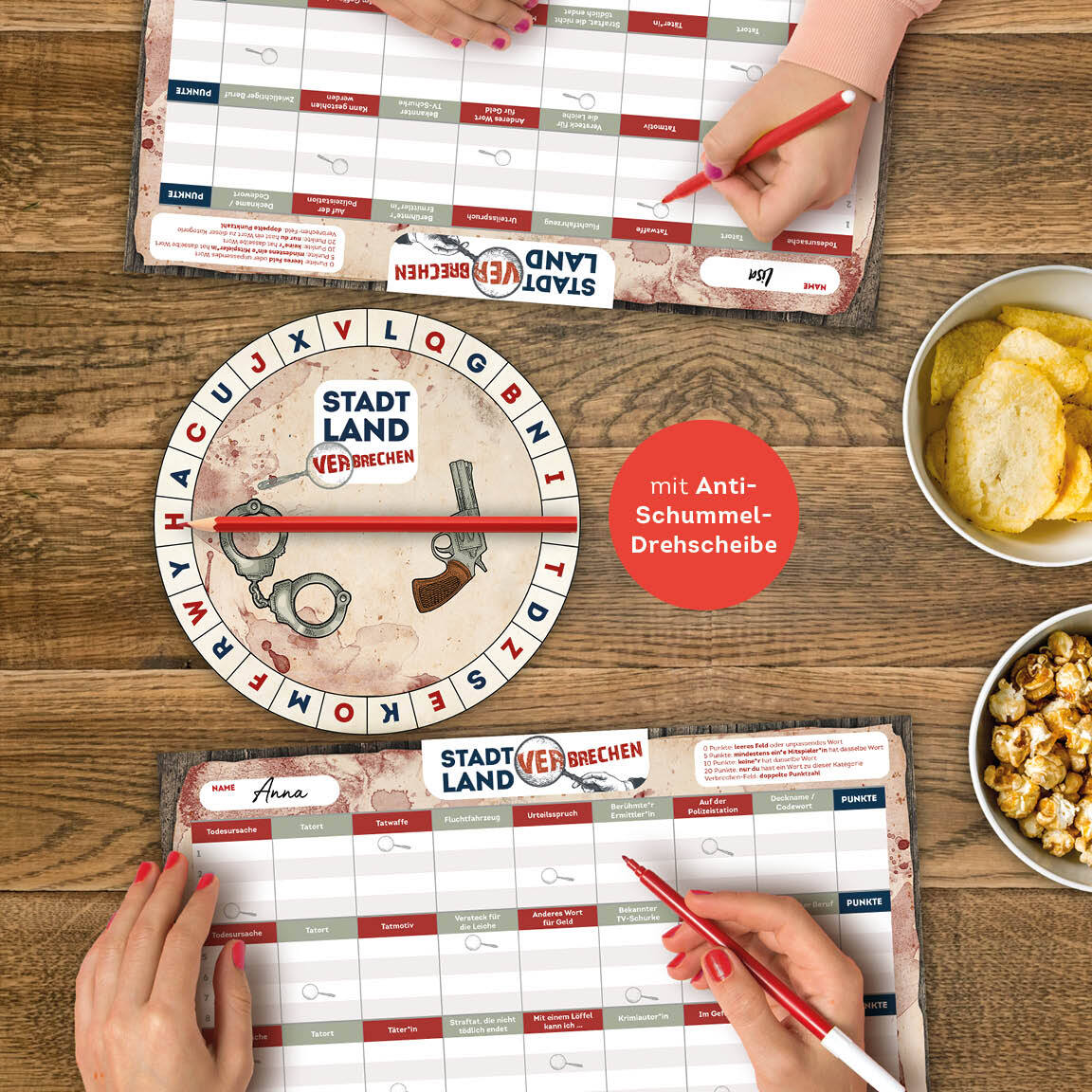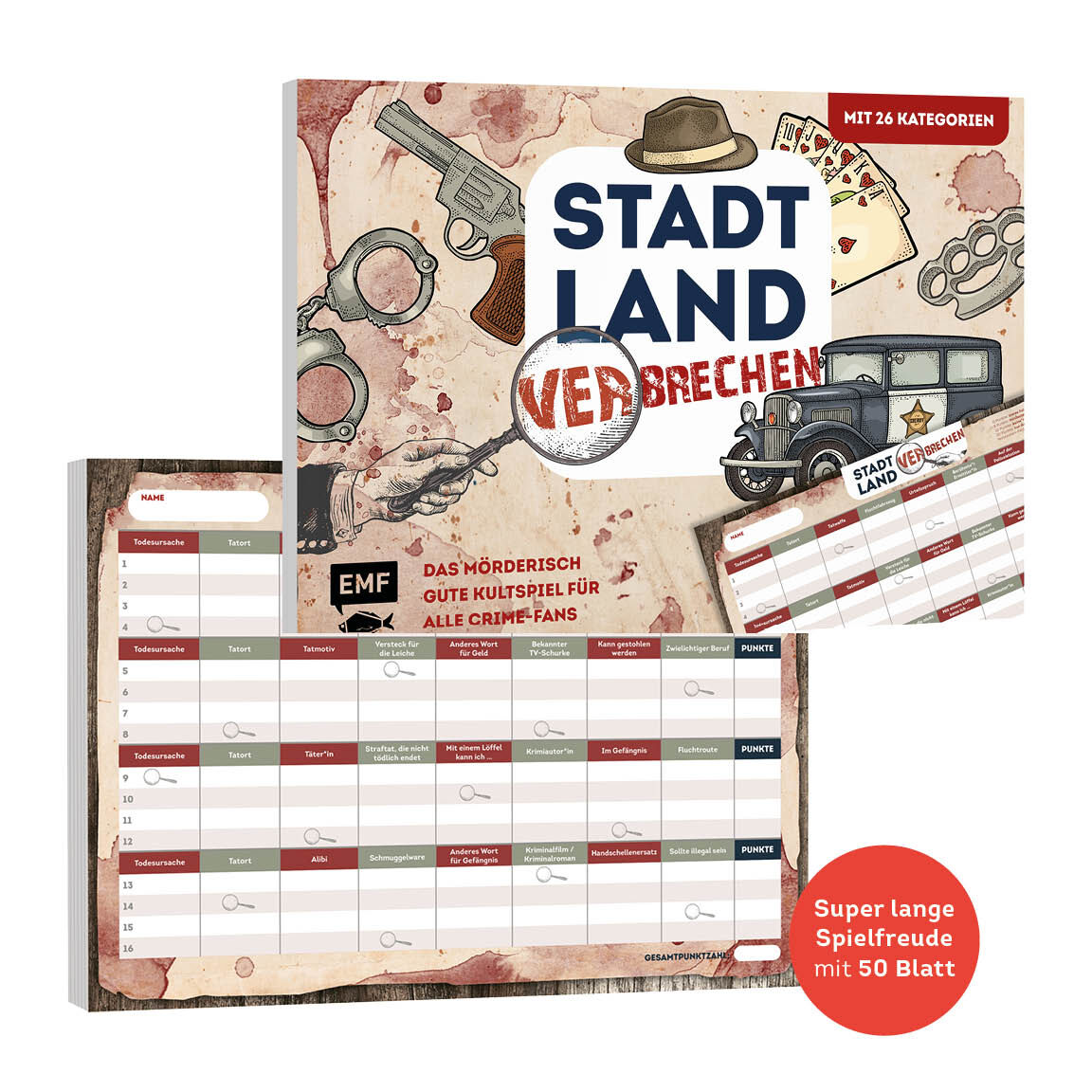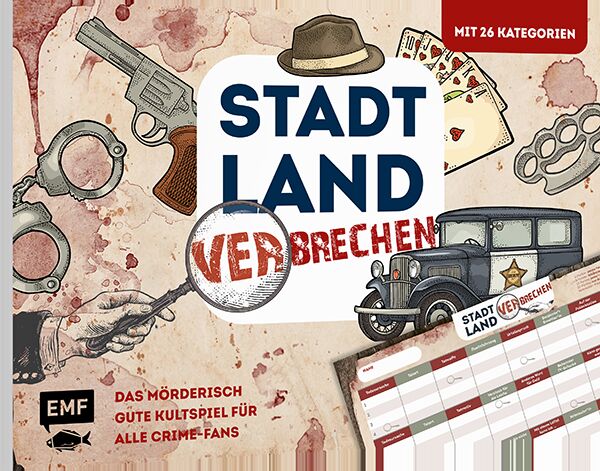 Der Spieleklassiker für alle Krimi-Fans von 12-99 Jahren Egal wo du bist - mit dieser Stadt, Land, Verbrechen-Edition bringst du immer eine große Portion Spaß mit in die Runde! In 26 mörderischen Kategorien könnt ihr euer Wissen rund um Spürnasen und Supersch...