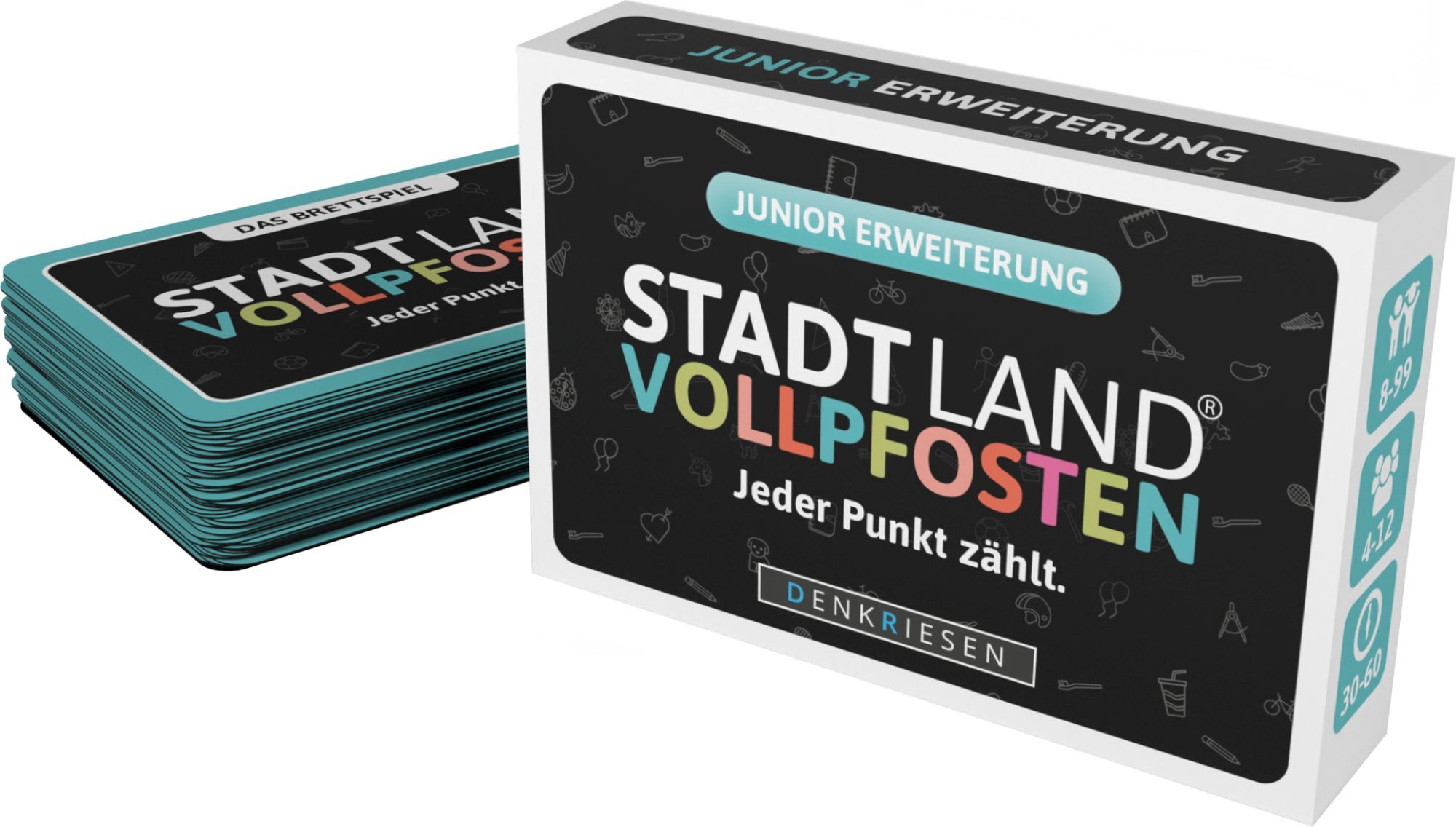 STADT LAND VOLLPFOSTEN® - Das Brettspiel - ERWEITERUNG - JUNIOR EDITION ''Jeder P Entdecke jetzt die offizielle Junior Erweiterung vom STADT LAND VOLLPFOSTEN Brettspiel. Enthalten sind 354 lustige und kindgerechte Kategorien. Nur mit dem original STADT LAND VO...