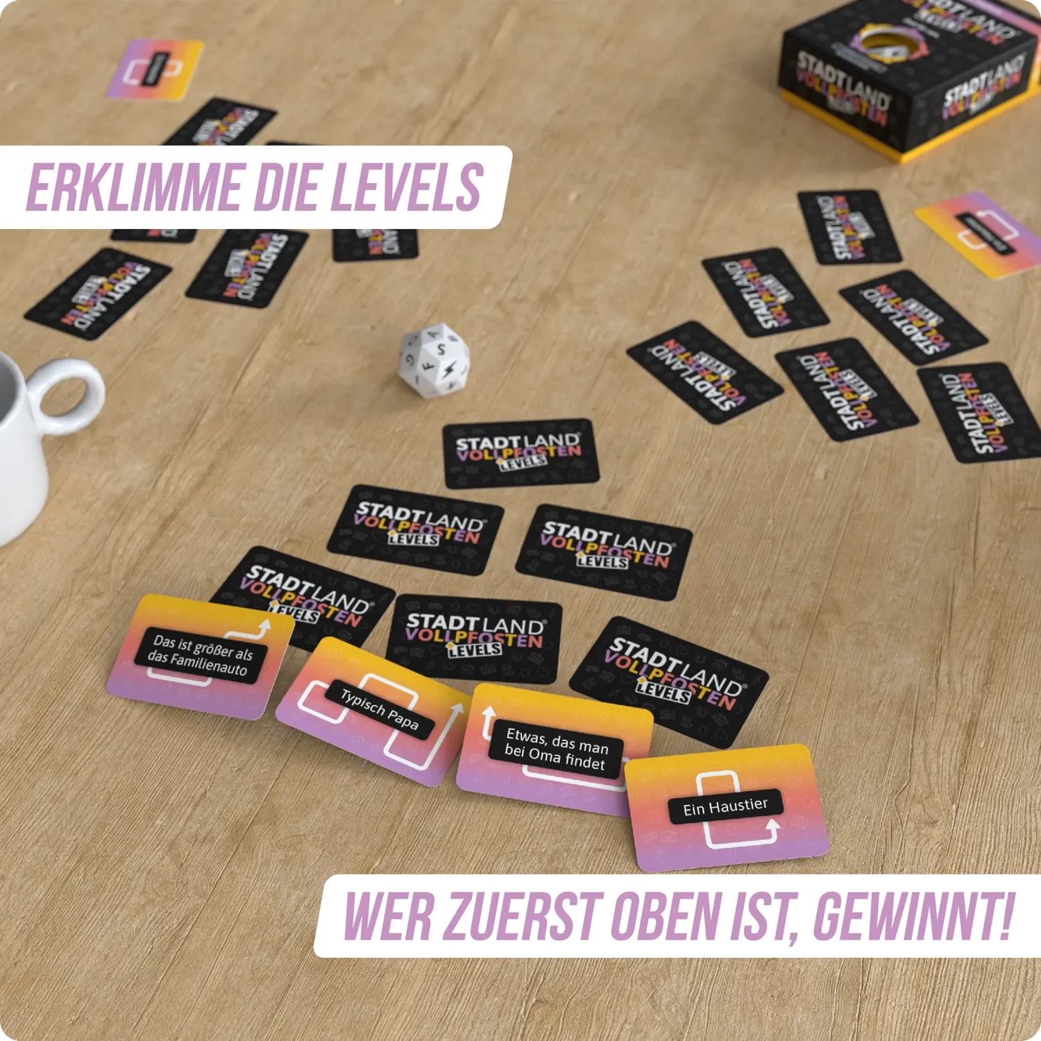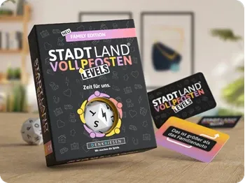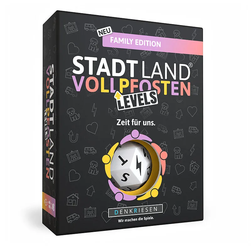 Stadt Land Vollpfosten® Family Edition - ''Zeit für uns.'' | Levels Bei dieser warmherzigen Variante von STADT LAND VOLLPFOSTEN geht's hoch hinaus! Findet passende Begriffe zum gewürfelten Buchstaben und erklimmt so die Levels. Wer zuerst oben ist, gewinnt!...