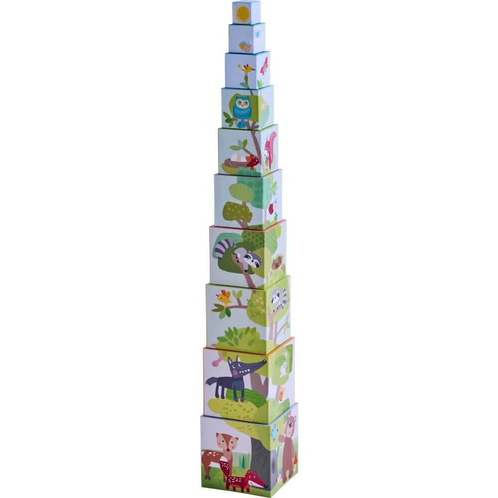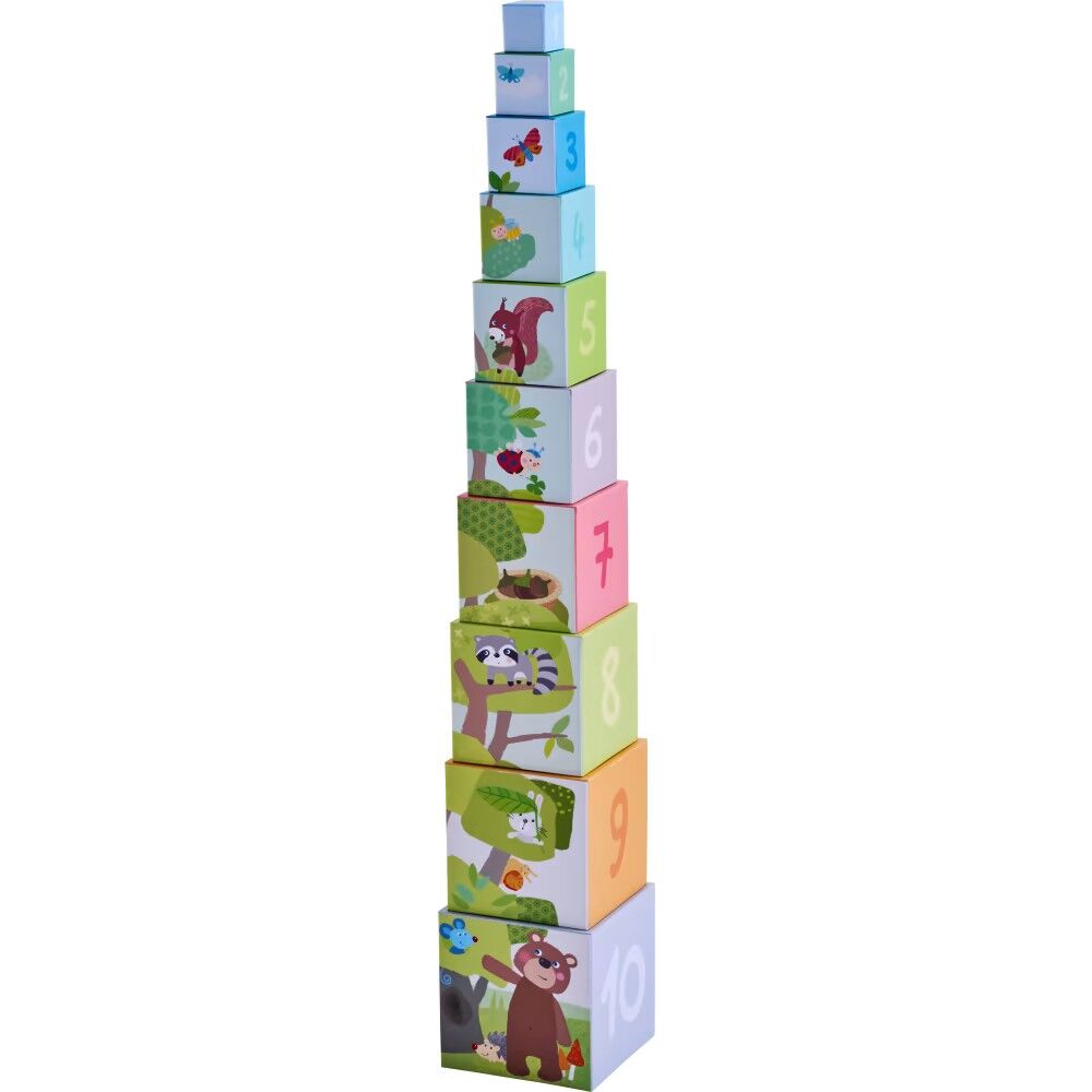 Zehn niedliche Waldfreunde grüßen von den HABA Stapelwürfeln - zum Kennenlernen der Zahlen und Mengen von 1 bis 10 - Motorikspielzeug mit putzigen Tiermotiven - die Würfel können aufeinander gesetzt und ineinander gesteckt werden - farbenfrohes Lernspielzeug a...