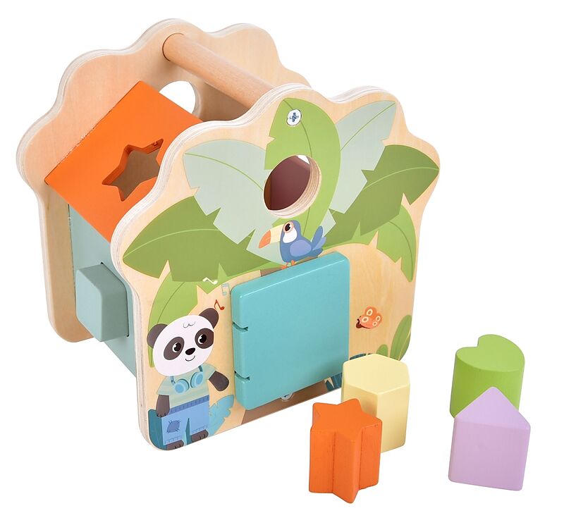 Sortieren, Stecken, Lernen dieser liebevoll gestaltete Steckwürfel in Hausform aus FSC 100%-zertifiziertem Holz begeistert mit fünf farbigen Stecksteinen, süßen Dschungelmotiven und exotischem Palmen-Print. Die passenden Öffnungen an den Seiten regen zum Zuord...