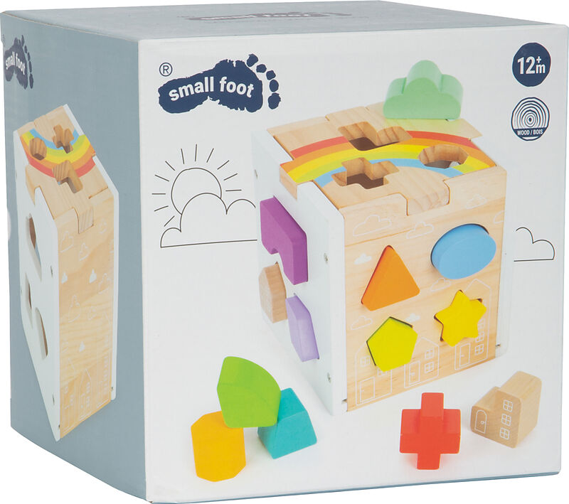Dieser moderne Steckwürfel aus robustem Holz kombiniert schlichtes Weiß, leuchtende Regenbogenfarben und einen hohen sichtbaren Vollholzanteil. 13 unterschiedlich geformte, farbige und zum Teil naturbelassene Steckelemente trainieren Farb- und Formerkennung so...