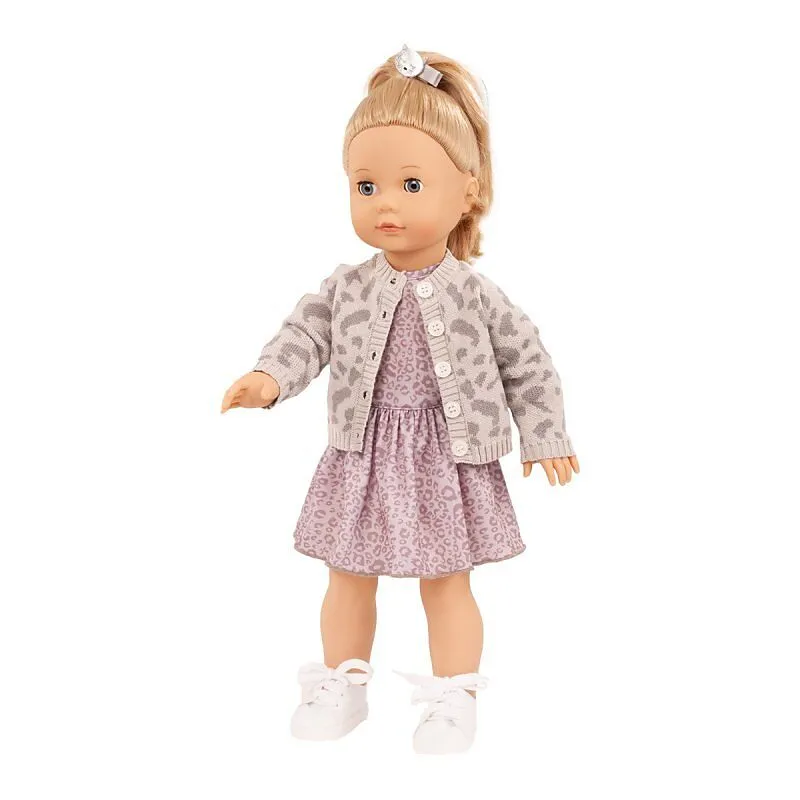 Die bezaubernde Spielpuppe Jessica Graue Katze fasziniert mit ihrem luftig-leichten Kleid im lila-grauen Leo-Print, das mit verspielten Trompetenärmeln und einem angerüschten Rock begeistert. Ihr Look wird durch eine modische Strickjacke im angesagten Leo-Desi...