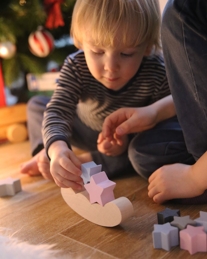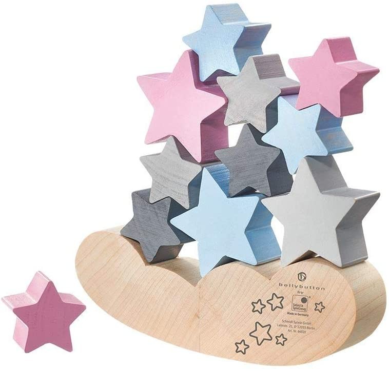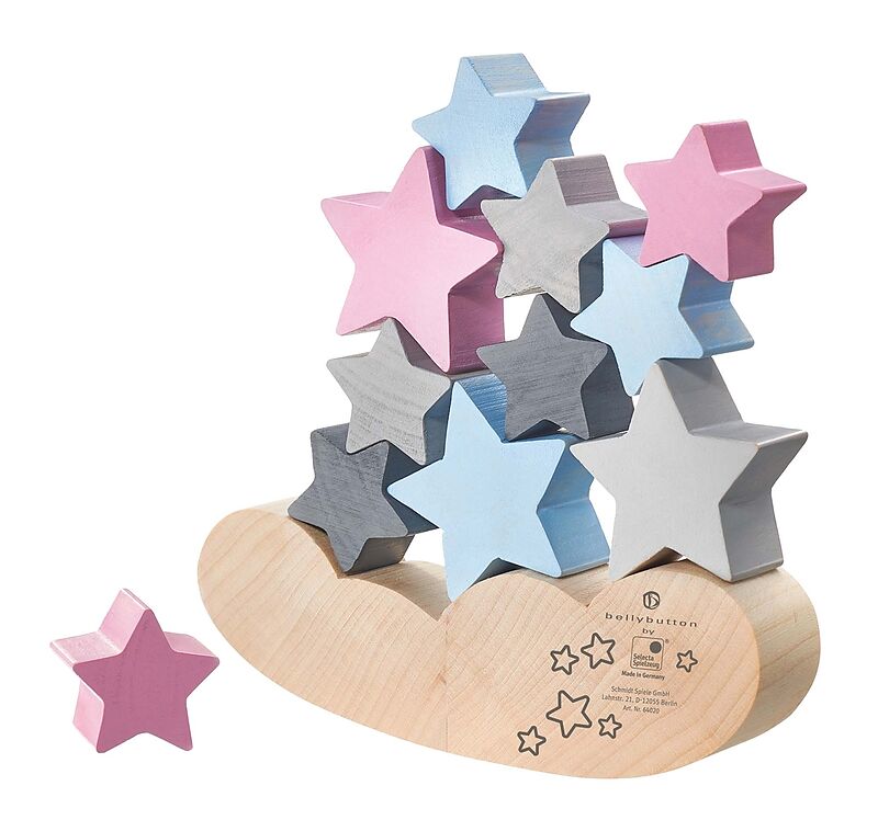 Stapelspiel mit Sternen zum Ausbalancieren. Unzählige Möglichkeiten, die unterschiedlich großen Sterne im klassischen bellybutton Design auf der abgerundeten Wolke aufzutürmen. Hier wird Stern auf Stern gesetzt und mit großem Wackel-Spaß auf der kippeligen Wol...