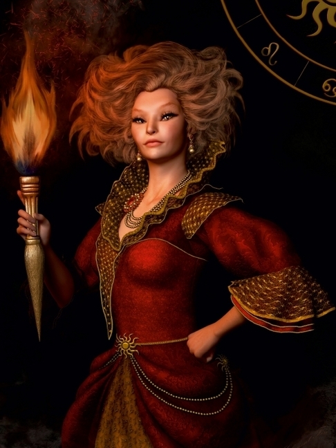 Sternzeichen Löwe, dargestellt durch eine Frau mit Löwenmähne und königlicher Kleidung. Das Zepter in ihrer Hand ist eine Fackel, die zugleich ihr Element Feuer repräsentiert. Der dazugehörige Planet, die Sonne, findet sich stilisiert oben rechts, wie auch als...