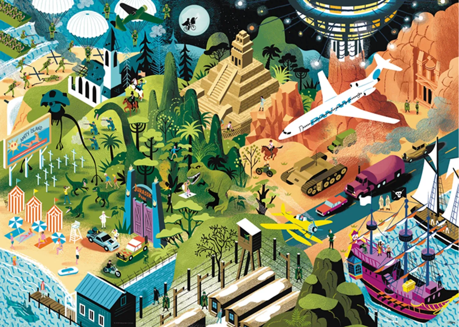 1000 Teile Sensationell: Die wichtigsten Protagonisten der berühmten Filme von Steven Spielberg alle in einem Bild! Und los geht's, schnell alle erraten, finden und puzzeln! Gelegte Größe: 50x70 cm.