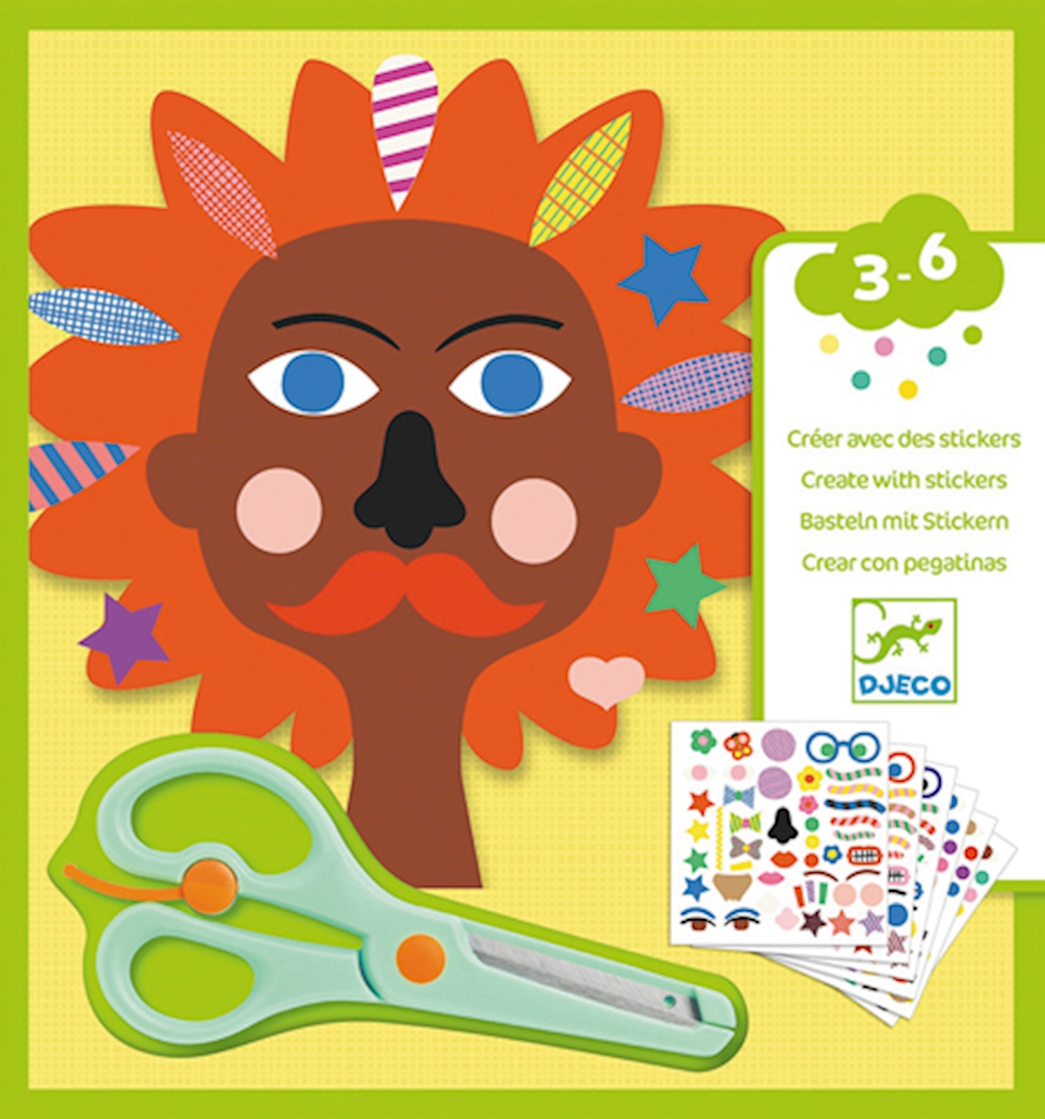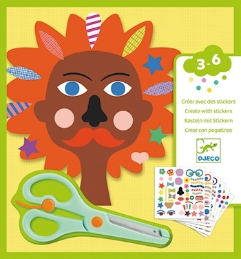 1x Schere 4x Vorlagen 6x Stickerbögen ab 3-6 Jahren 20 x 20cm Verziere die lustigen Figuren nach belieben mit den coolen Stickern.