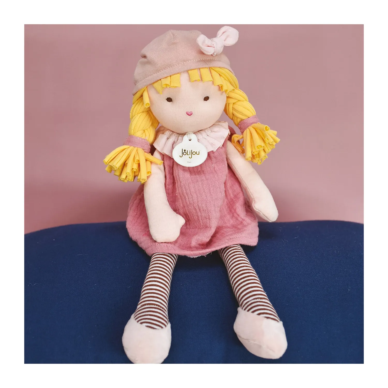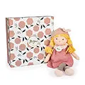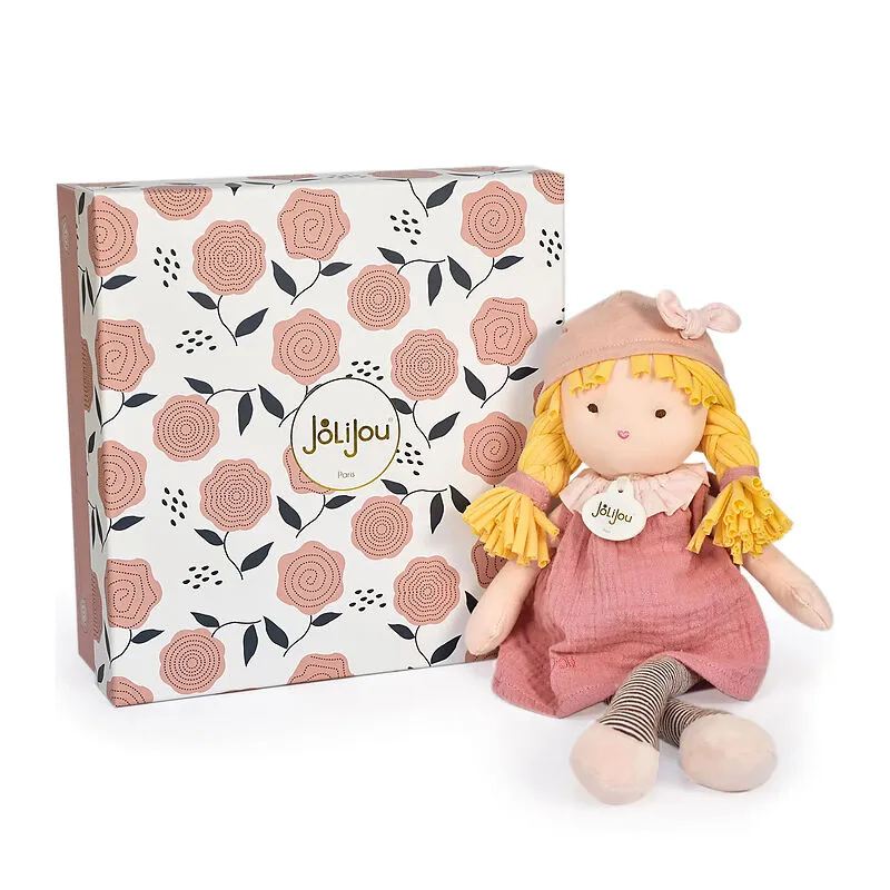 Süsse Stoffpuppe mit blonden Zöpfen, rosa Mütze und rosa Kleid. Ideales Geschenk zur Geburt. Verpackt im dazu passenden Geschenkkarton. Maschinenwäsche bei 30° Grad. Grösse: 30cm.