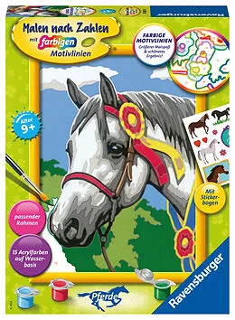 Farbige Motivlinien: Größerer Malspaß & ein schöneres Ergebnis! Dank der farbigen Motivlinien, können die Kinder das ganze Motiv Stolzes Turnierpferd und die Farben schneller erkennen. Der Pinsel hat eine gute Führung und so entsteht nach und nach ein perf...