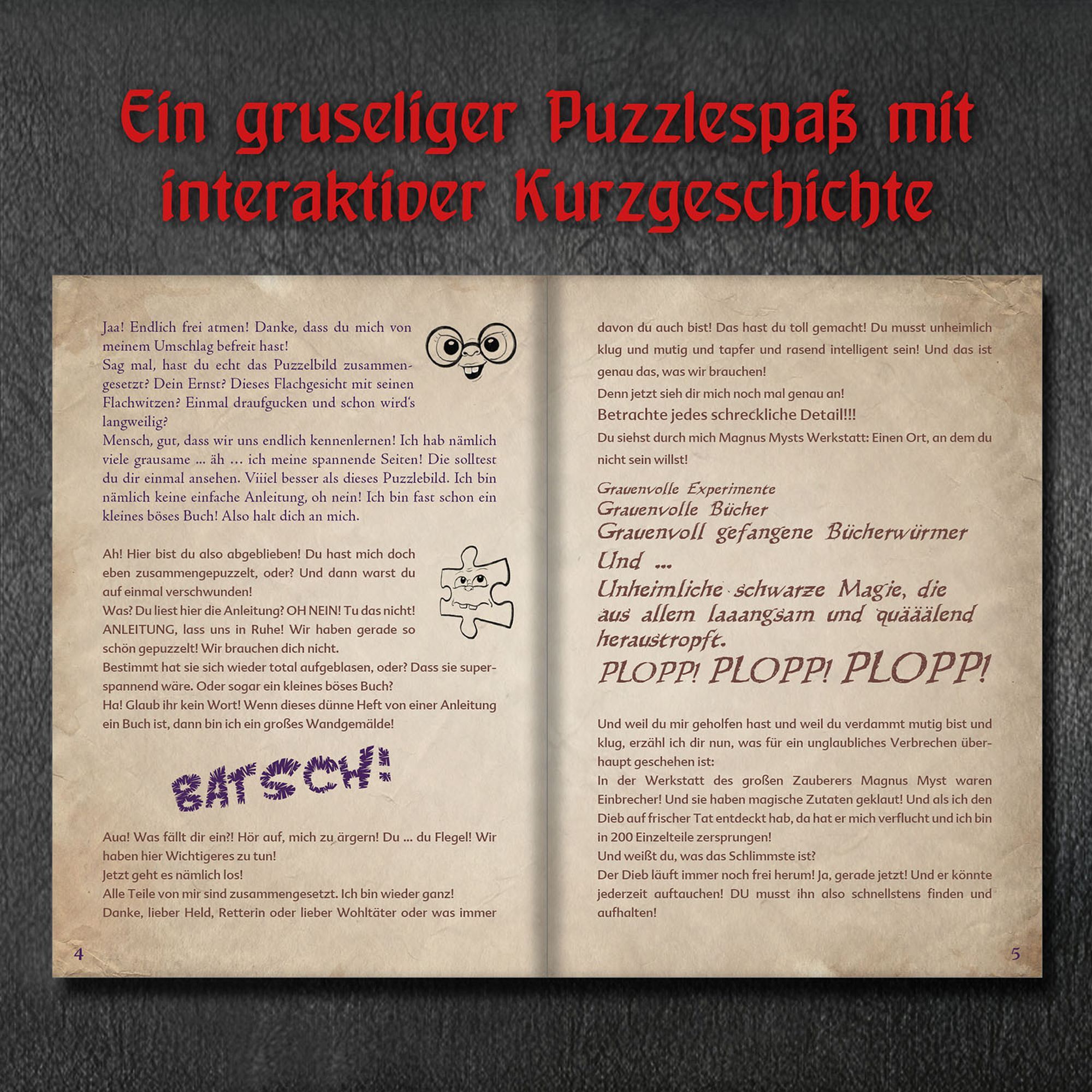 Story Puzzle - Das kleine böse Puzzle Mithilfe dringend benötigt! Das kleine Böse Puzzle wurde im Labor des großen Zauberers Magnus Myst verflucht! Von wem? Daran kann es sich nicht mehr erinnern! Nur seine letzte Erinnerung liegt in 200 Teilen verstreut vor d...