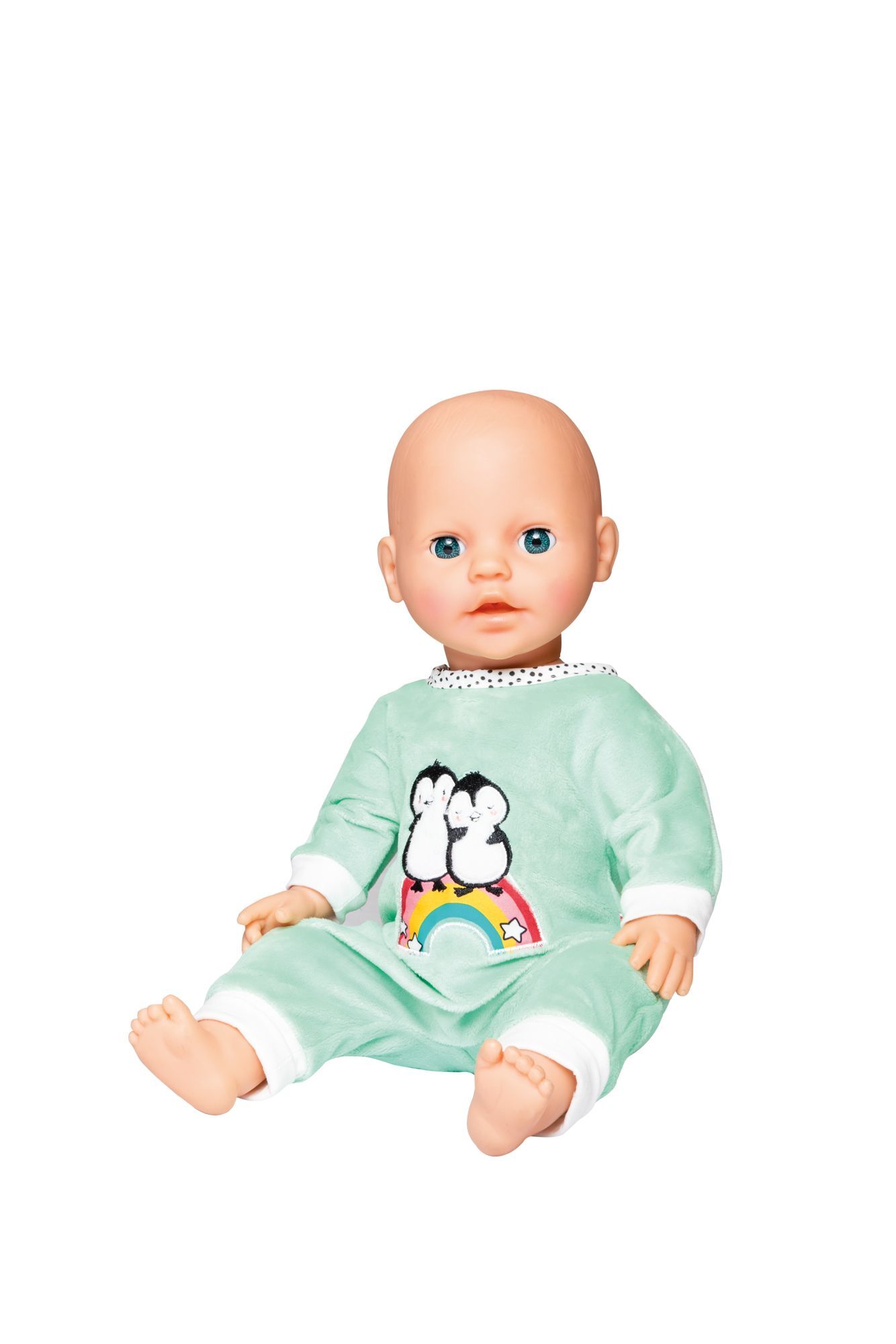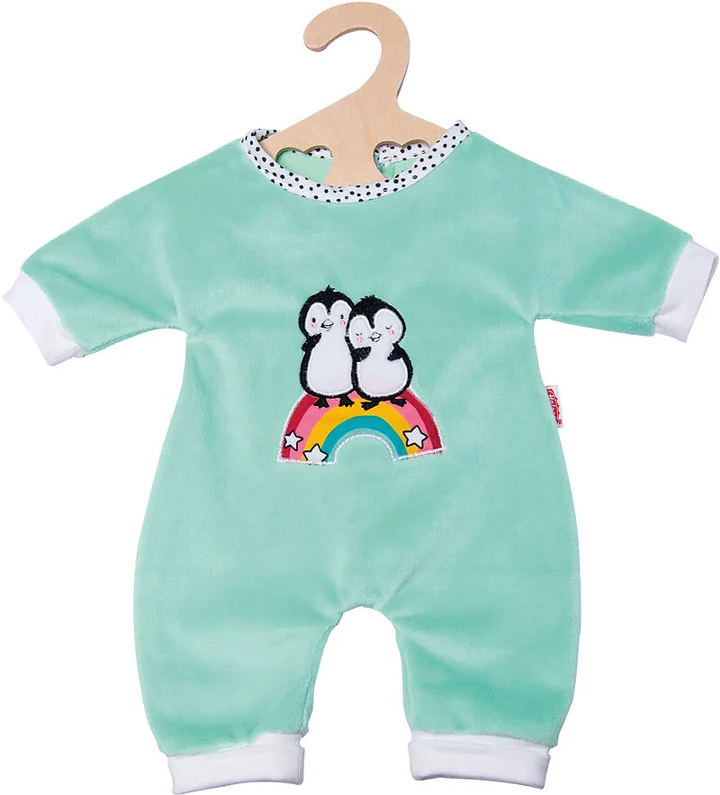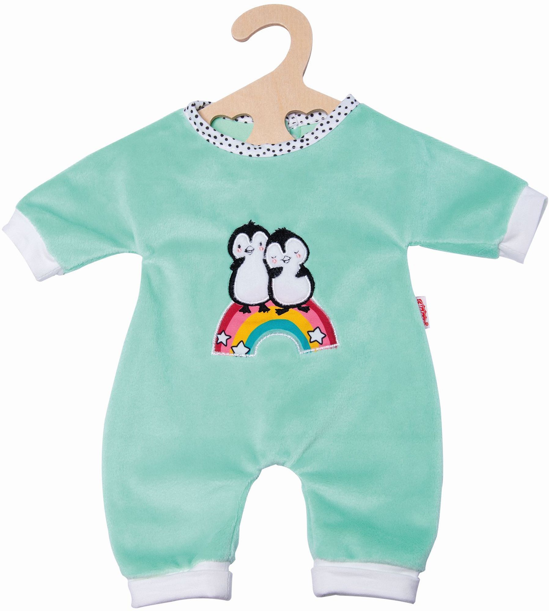 Flauschiger Puppen-Strampler in mintgrün aus kuscheligem Softvelours mit hochwertiger Pinguin-Bestickung. Mit Klettverschluss, wird auf einem Holzbügel geliefert. Passend für Puppen der Grösse 28-35 cm.