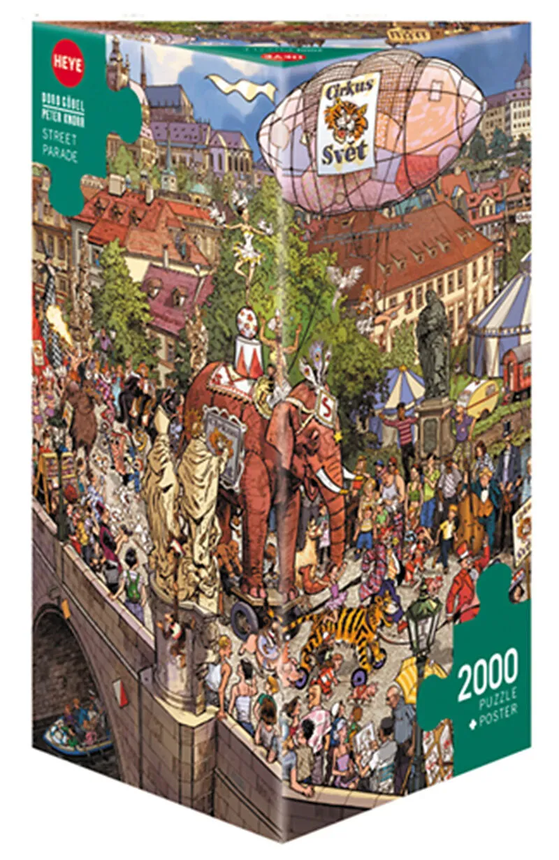 Da bebt die Brücke, wenn ein Elefant drüber geht. Aber es ist ja nicht nur der, sondern eine immens vielfältige Mensch-Tier-Mischung. Ganz großes Puzzle-Amüsement! Gelegte Größe: 96,6x68,8 cm.