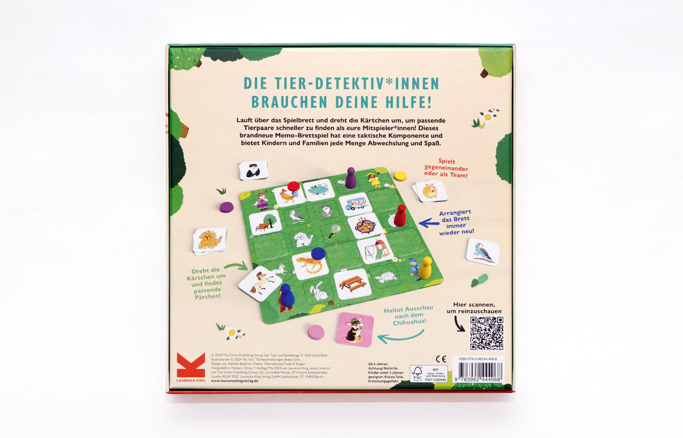 -Neue Memo-Variante als Brettspiel-Kein Gewöhnungseffekt - lässt sich immer wieder neu arrangieren-Lässt sich gegeneinander oder als Team spielenWas ist denn da im Park los??! Die Menschen suchen dringend ihre Tiere! Helft ihnen und lauft als Tier-Detektivinne...