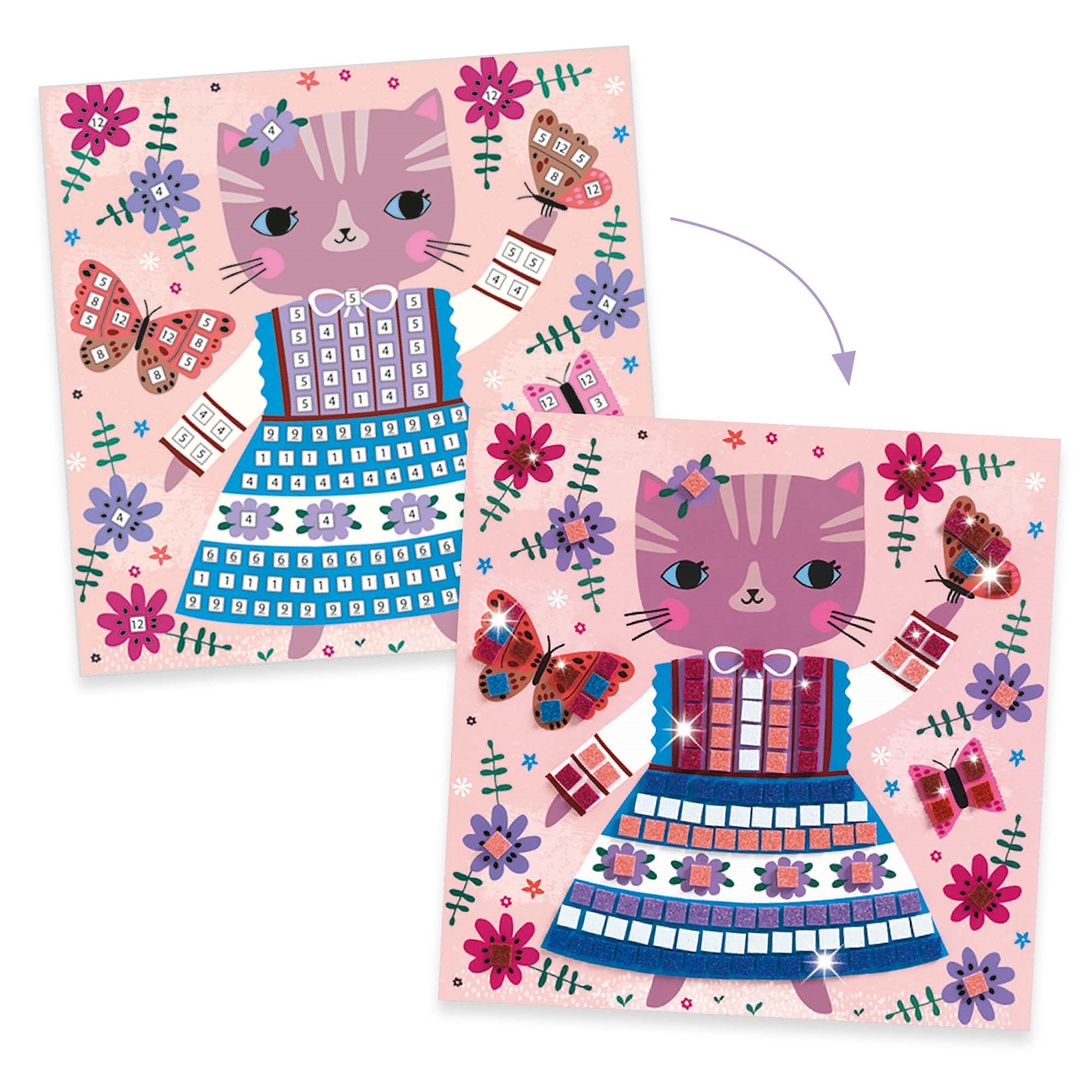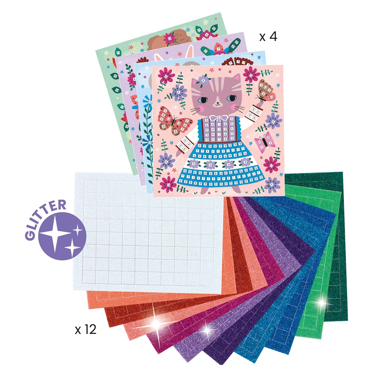 ab 5 Jahren 4x Illustrierte Karten 12x Bögen mit selbstklebenden Mosaiksteine aus Schaumstoff Eine Box, um die Kunst des Mosaiks zu lernen, indem man die Outfits dieser liebenswerten Charaktere verschönert. 4 Bilder zum Vervollständigen mit kleinen Quadraten a...
