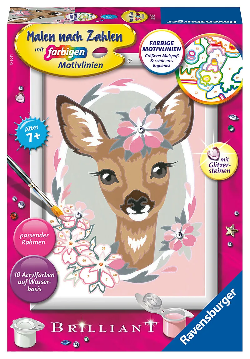 Inhalt: eine Maltafel (13 x 18 cm) mit Malfeldern in altersgerechter Grösse, 10 Acrylfarben in wiederverschliessbaren Näpfchen, einen Qualitätspinsel und einen passenden, hochwertigen Bilderrahmen. Mit Anleitung und Vorlageblatt.