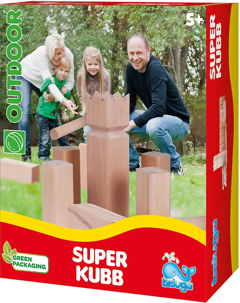 1 König 28 cm, 10 Holzblöcke 14 cm, 4 Eckmarkierungen 28 cm, 6 Wurfhölzer 28 cm