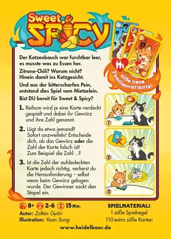 Genau wie bei Spicy werden die Karten verdeckt ausgespielt, sodass man bei der Ansage seiner Karte schon mal flunkern kann. Doch es geht nicht einfach nur darum, überzeugend zu bluffen. Denn eine Karte, die zumindest halb richtig ist, kann man bei geschicktem ...