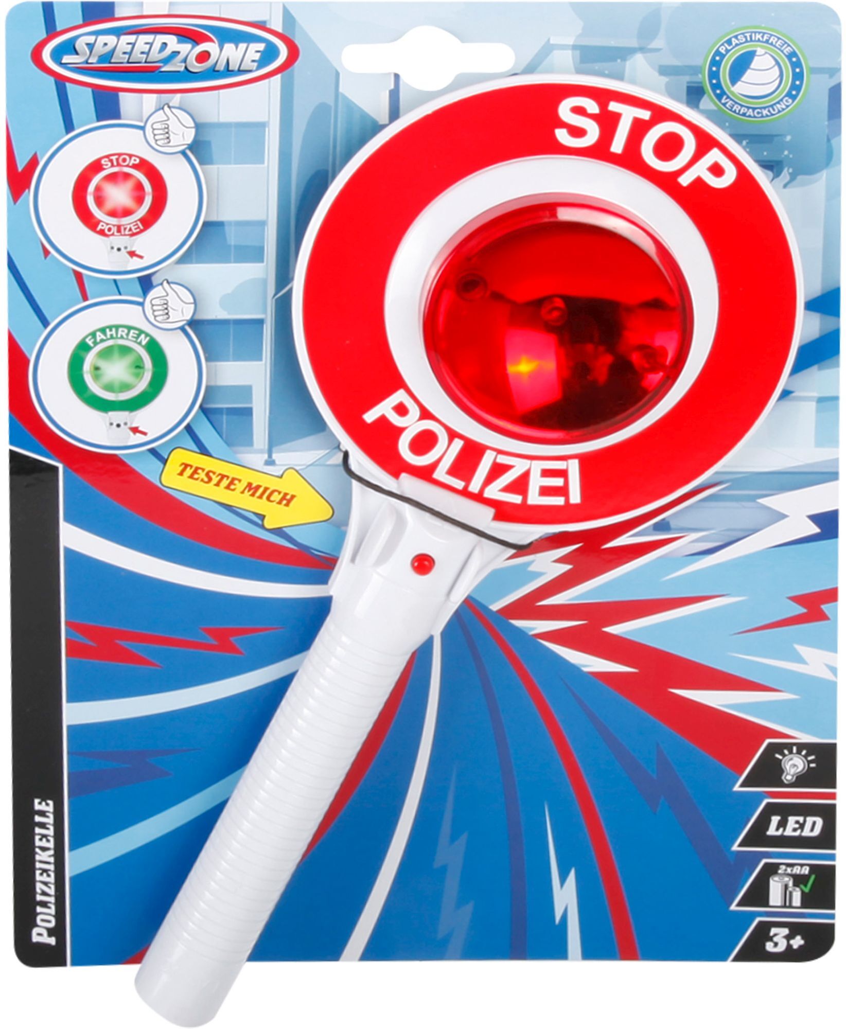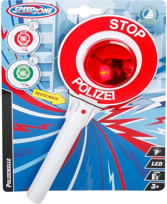 Speedzone Polizeikelle mit 2 LED-Lichter. Inklusive 2x AA Batterien. Mit elektrischem Lichtsignal. Maße ca. 25x11,50x3,50 cm. Auf Pappkarte. Kartengröße W190xH250 mm. Für Kinder ab 3 Jahren.