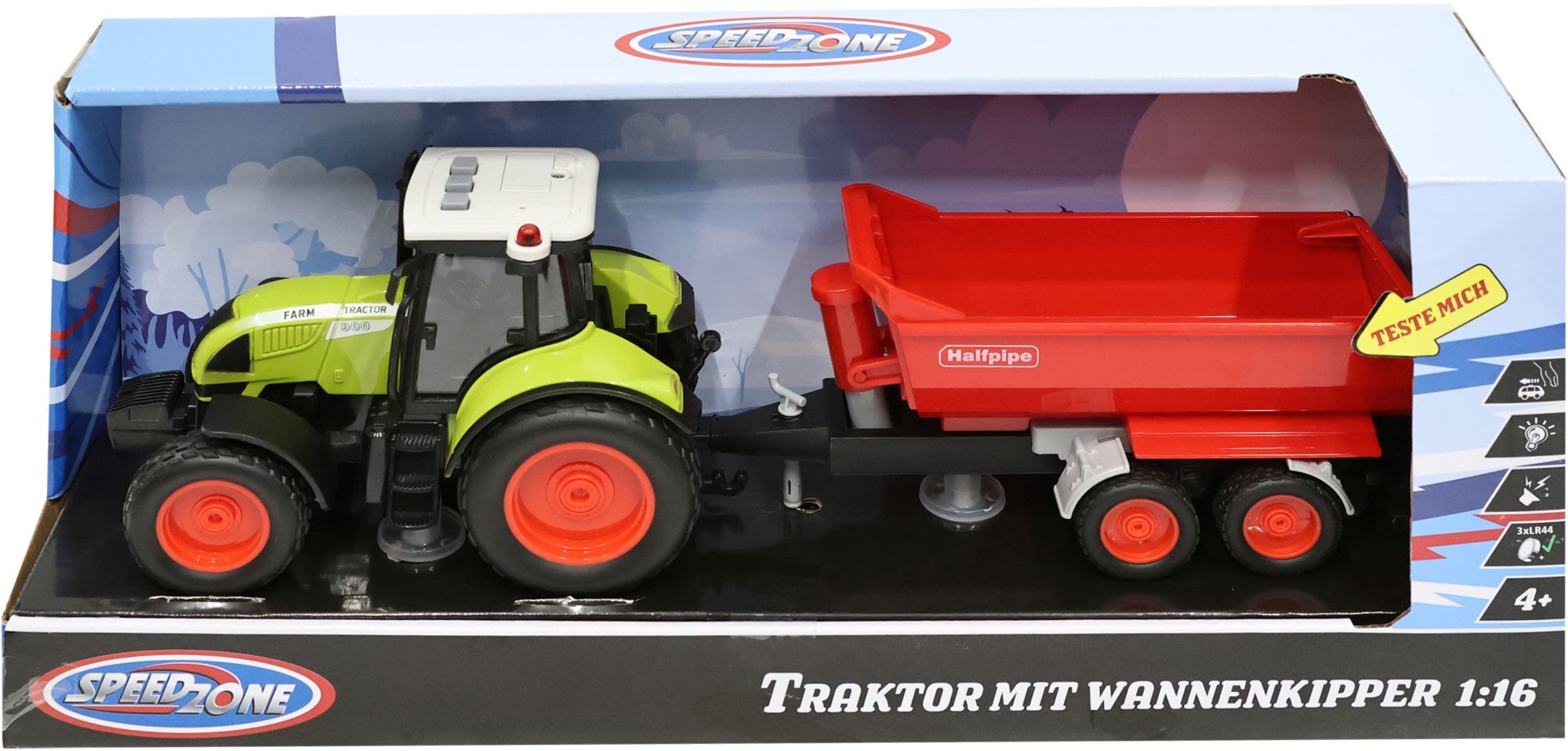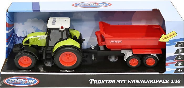 Speedzone Traktor mit einem Wannenkipper. Mit Licht und Sound Funktion. Mit Friktion. Inklusive 3xLR44 Batterien. Maßstab 1:16. Für Kinder ab 4 Jahren.