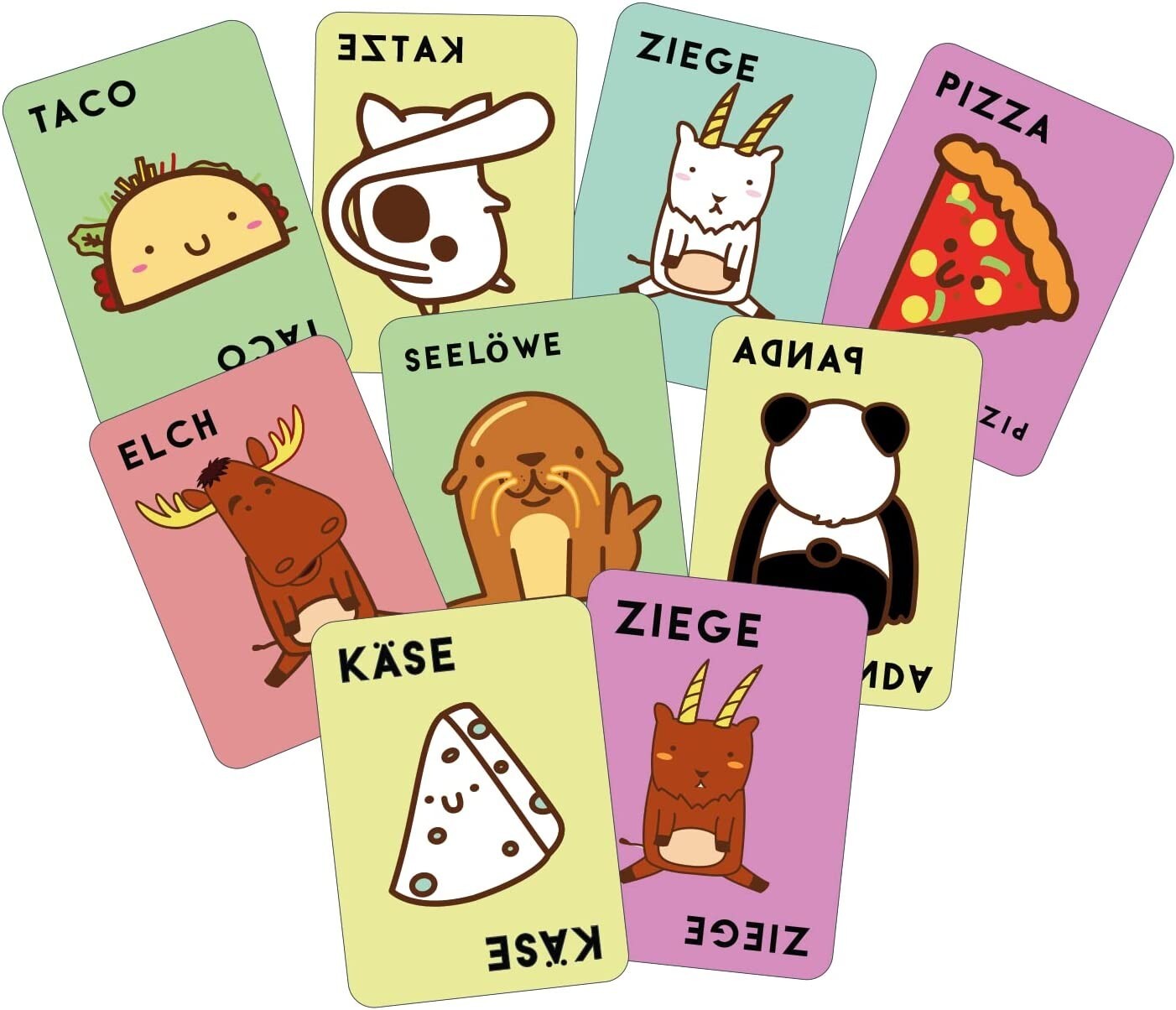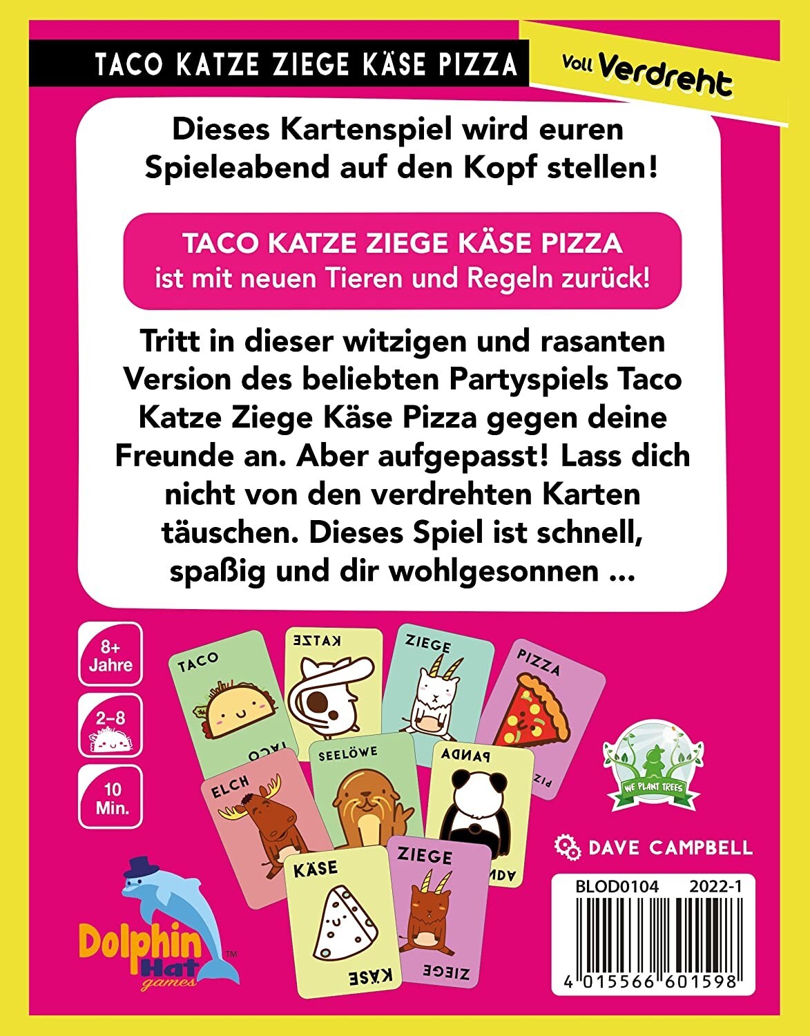Taco Katze Ziege Käse Pizza ist mit neuen Tieren und Regeln zurück. Aber aufgepasst! Lass dir von den verdrehten Karten nicht den Kopf verdrehen. Taco Katze Ziege Käse Pizza: Voll Verdreht ist eine eigenständige Variante des verrückten Reaktionsspiels Taco Kat...