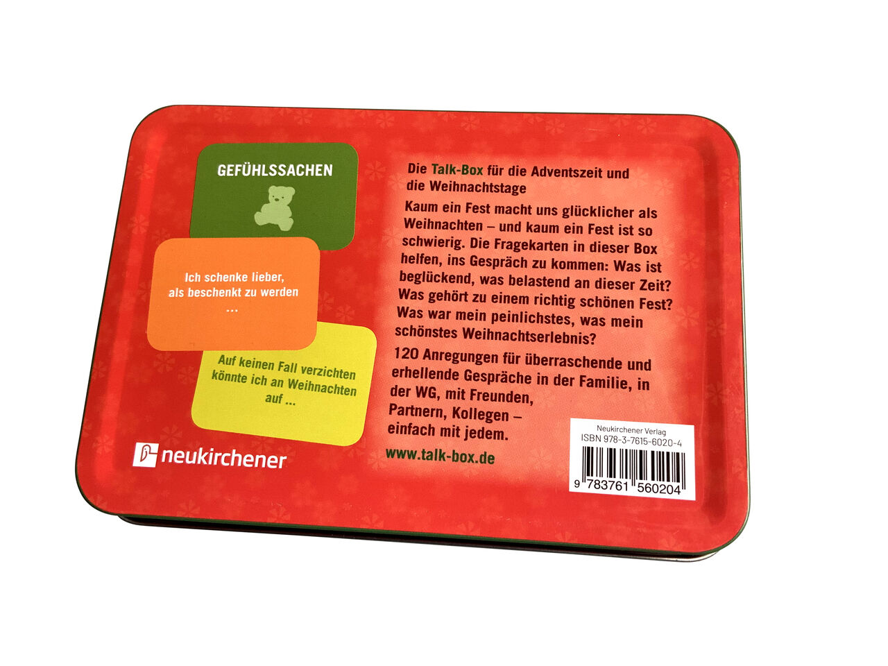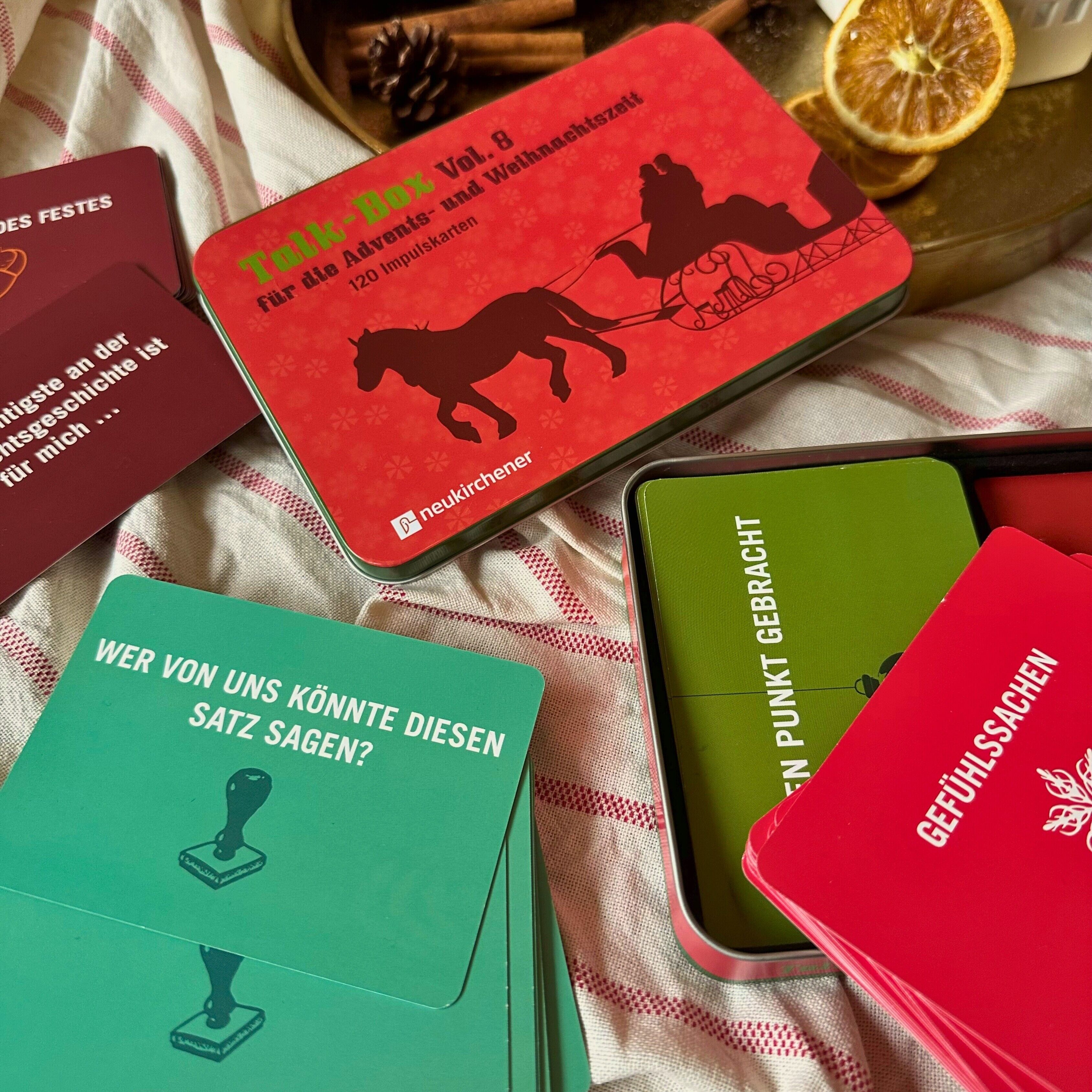Was bewegt uns an Weihnachten? Was beglückt uns besonders? Nähern Sie sich der besonderen Zeit auf spielerische Weise. Die 120 Impulskarten der Talk-Box Vol. 8 bringen zutage, was uns an Weihnachten bewegt, beglückt oder herausfordert - und eignen sich aus die...