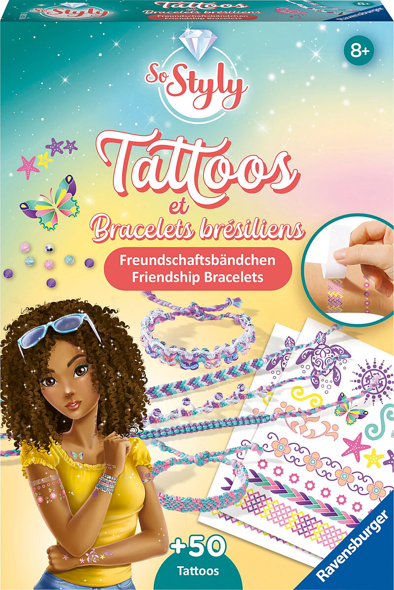 Tattoos & Friendsbands: Cool Summer. Mit diesem Komplettset von Ravensburger haben Kinder ab 8 Jahren eine Auswahl an 50 verschiedenen Transparent-Tattoos. Außerdem beinhaltet das 2-in-1-Produkt viele Utensilien zur Herstellung der perfekten Freundschaftsarmbä...