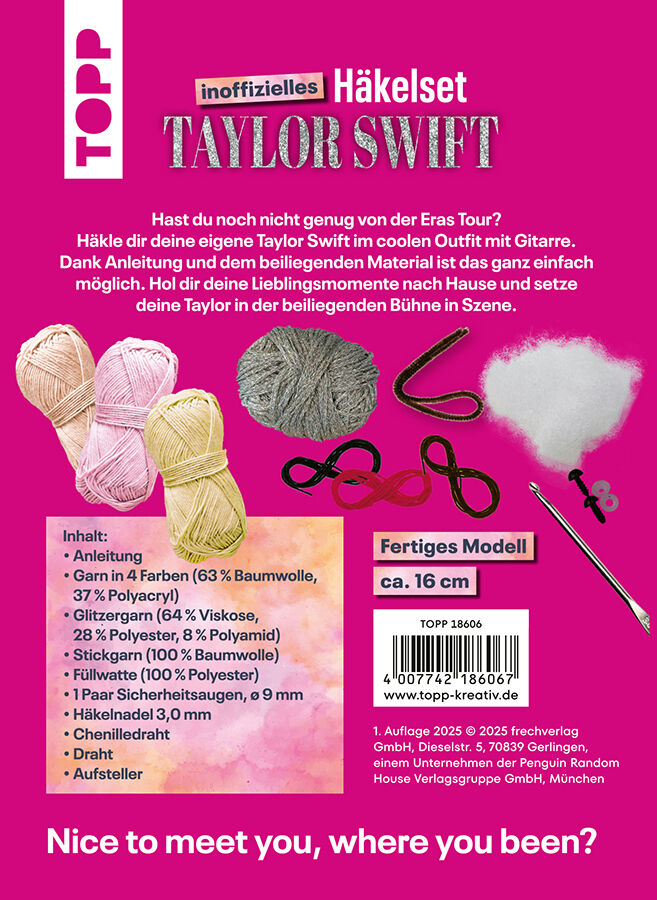 inoffiziell Hast du noch nicht genug von der Eras Tour? Häkle dir deine eigene Taylor Swift im coolen Outfit mit Gitarre. Dank Anleitung und dem beiliegenden Material ist das ganz einfach möglich. Hol dir deine Lieblingsmomente nach Hause und setze deine Taylo...