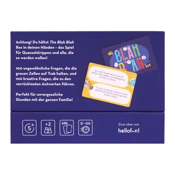 Achtung! Du hältst The Blah Blah Box in deinen Händen - das Spiel für Quasselstrippen und alle, die es werden wollen! 100 ungewöhnliche Fragen, die die grauen Zellen auf Trab halten, und 100 kreative Fragen, die zu den verrücktesten Antworten führen. Perfekt f...